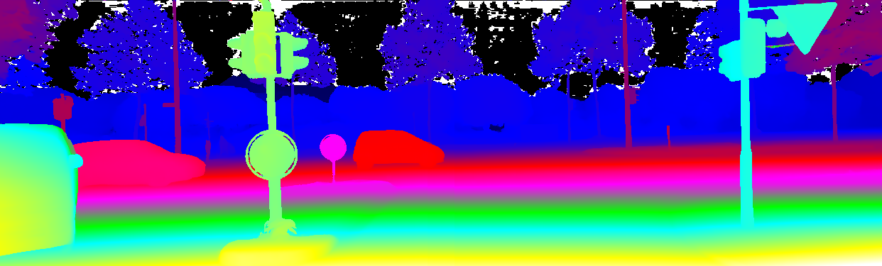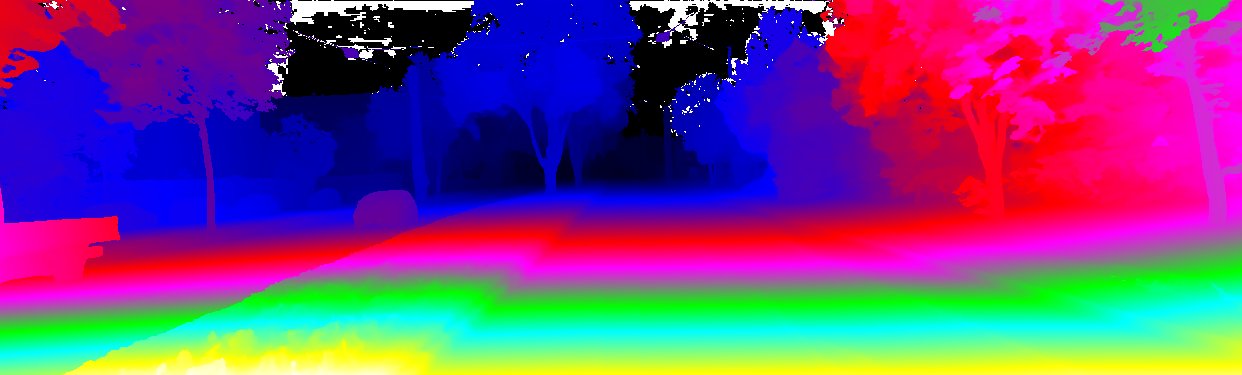 This page provides detailed results for the method(s) selected. For the first 20 test images, the percentage of erroneous pixels is depicted in the table. We use the error metric described in Object Scene Flow for Autonomous Vehicles (CVPR 2015), which considers a pixel to be correctly estimated if the disparity or flow end-point error is <3px or <5% (for scene flow this criterion needs to be fulfilled for both disparity maps and the flow map). Underneath, the left input image, the estimated results and the error maps are shown (for disp_0/disp_1/flow/scene_flow, respectively). The error map uses the log-color scale described in Object Scene Flow for Autonomous Vehicles (CVPR 2015), depicting correct estimates (<3px or <5% error) in blue and wrong estimates in red color tones. Dark regions in the error images denote the occluded pixels which fall outside the image boundaries. The false color maps of the results are scaled to the largest ground truth disparity values / flow magnitudes.