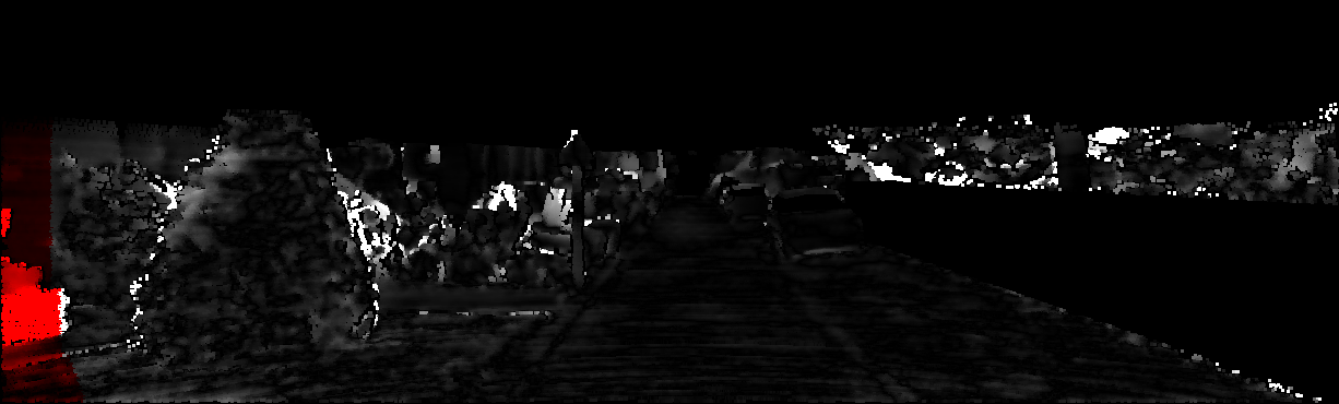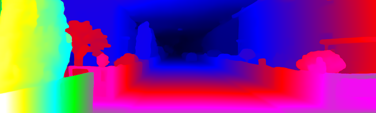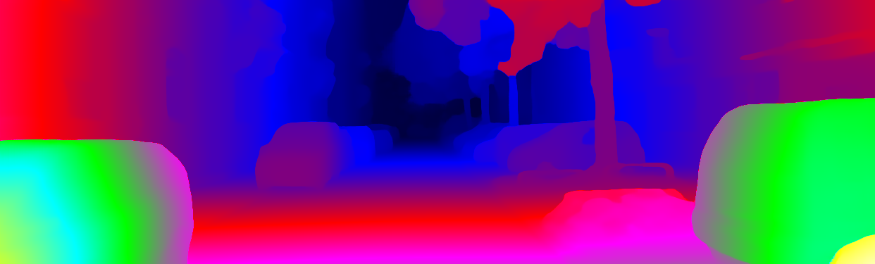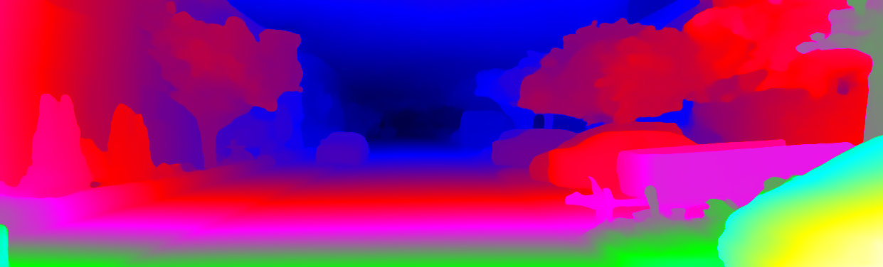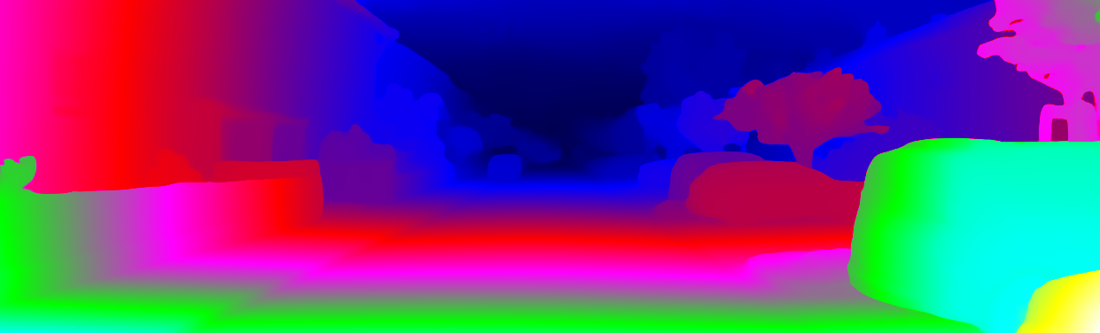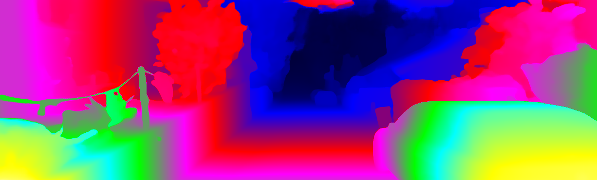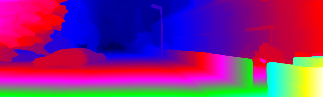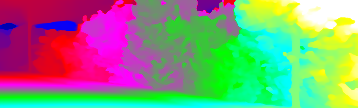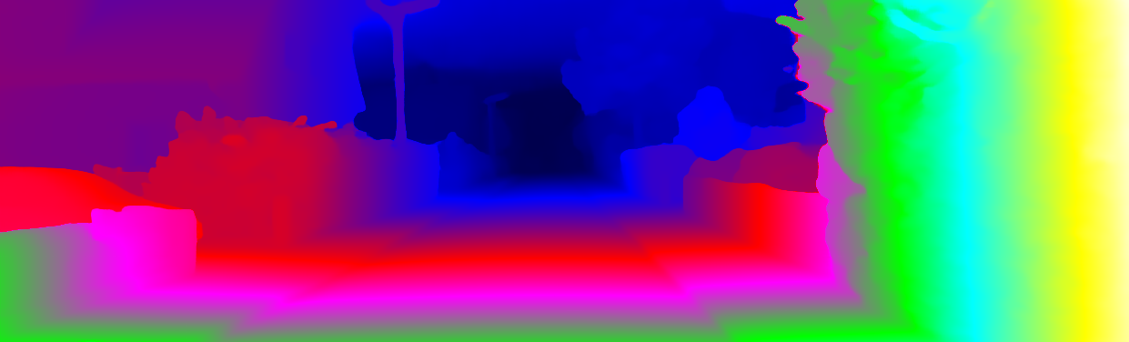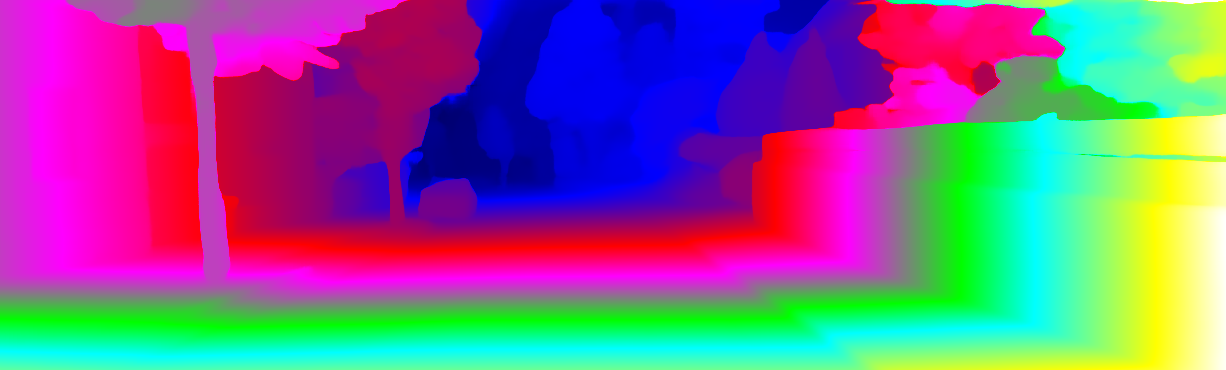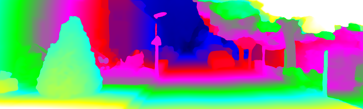 This page provides detailed results for the method(s) selected. For each of the first 20 test images, the number of erroneous pixels at all thresholds is depicted in the table. Underneath, the left input image, the disparity / end-point error map and the estimated (and interpolated) disparity / optical flow map are shown. The error map scales linearly between 0 (black) and >=5 (white) pixels error. Red denotes all occluded pixels, falling outside the image boundaries. The false color map is scaled to the largest ground truth disparity / flow value.