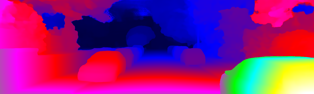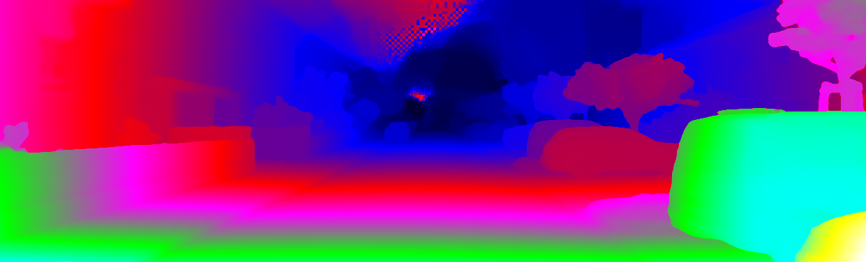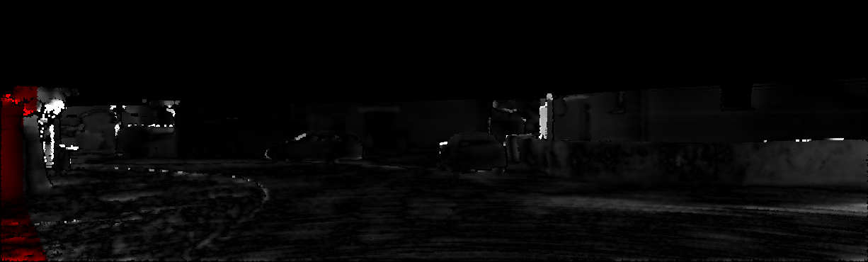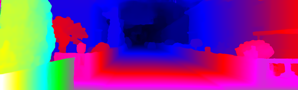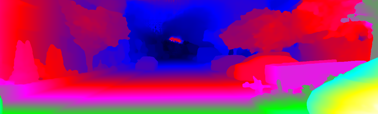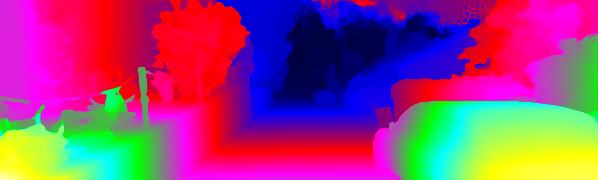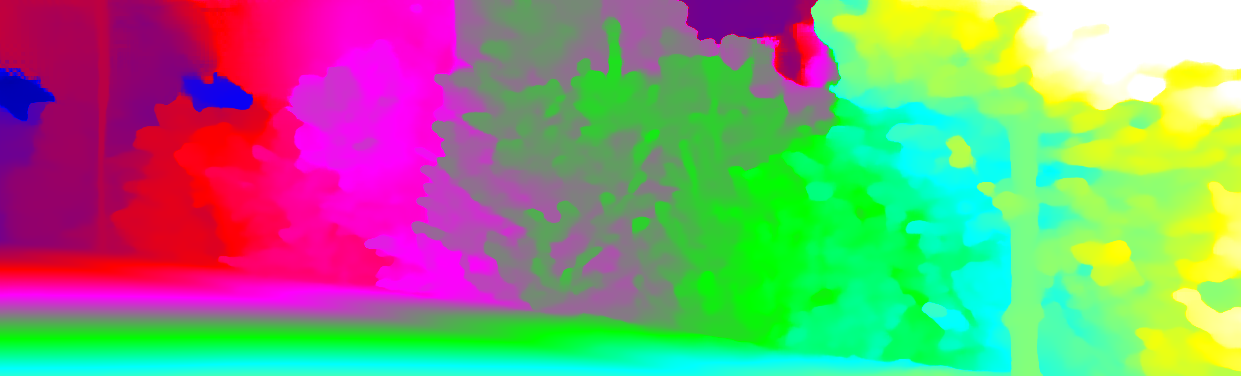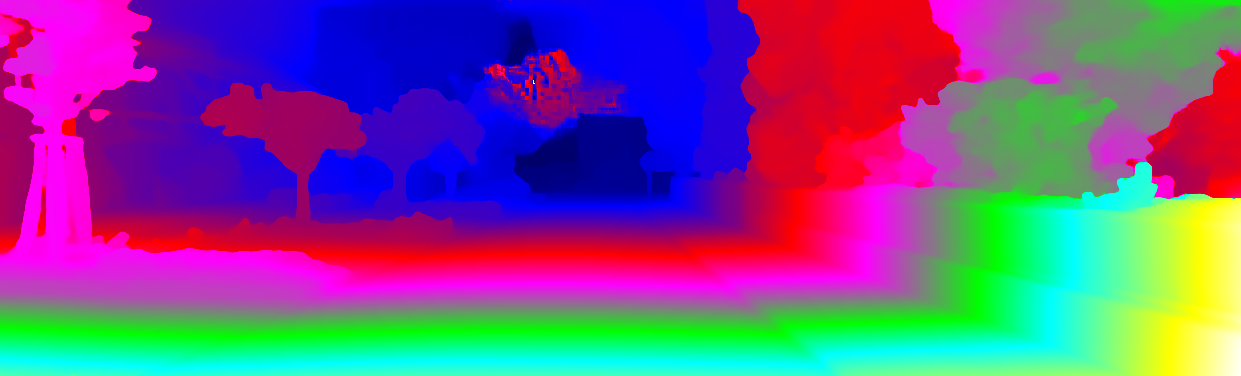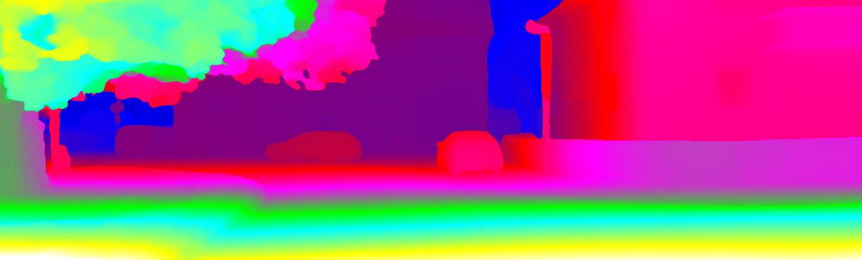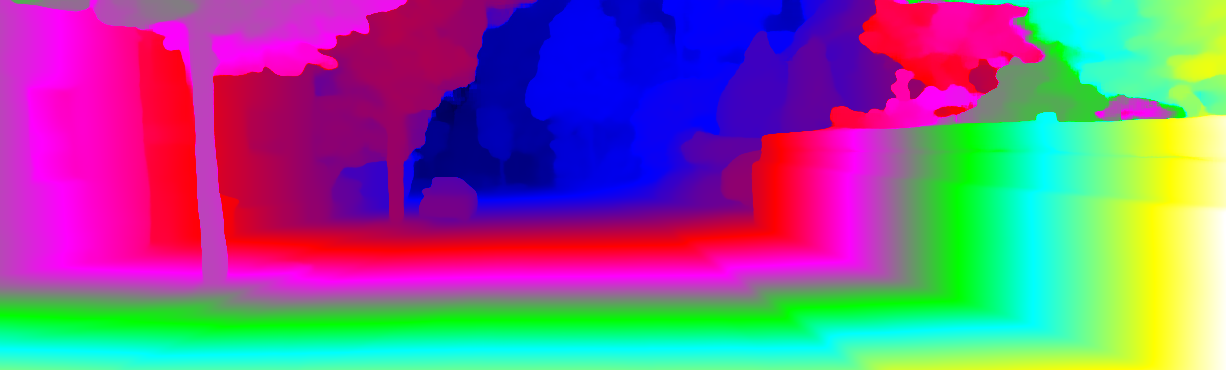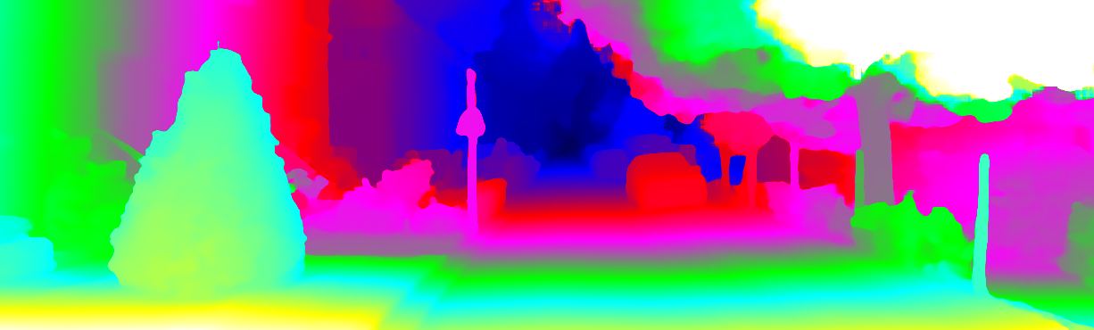 This page provides detailed results for the method(s) selected. For each of the first 20 test images, the number of erroneous pixels at all thresholds is depicted in the table. Underneath, the left input image, the disparity / end-point error map and the estimated (and interpolated) disparity / optical flow map are shown. The error map scales linearly between 0 (black) and >=5 (white) pixels error. Red denotes all occluded pixels, falling outside the image boundaries. The false color map is scaled to the largest ground truth disparity / flow value.