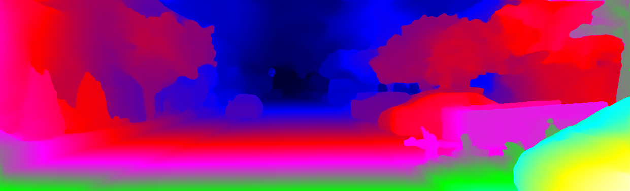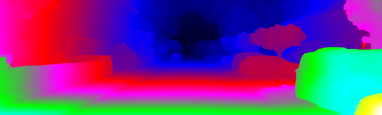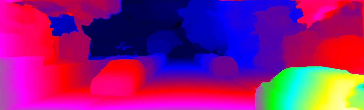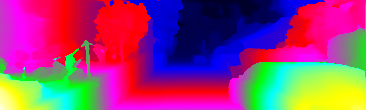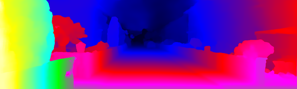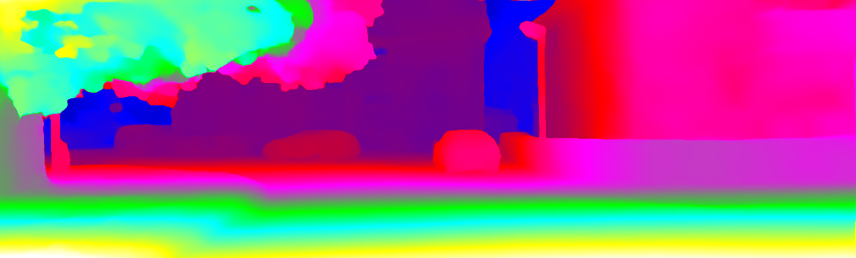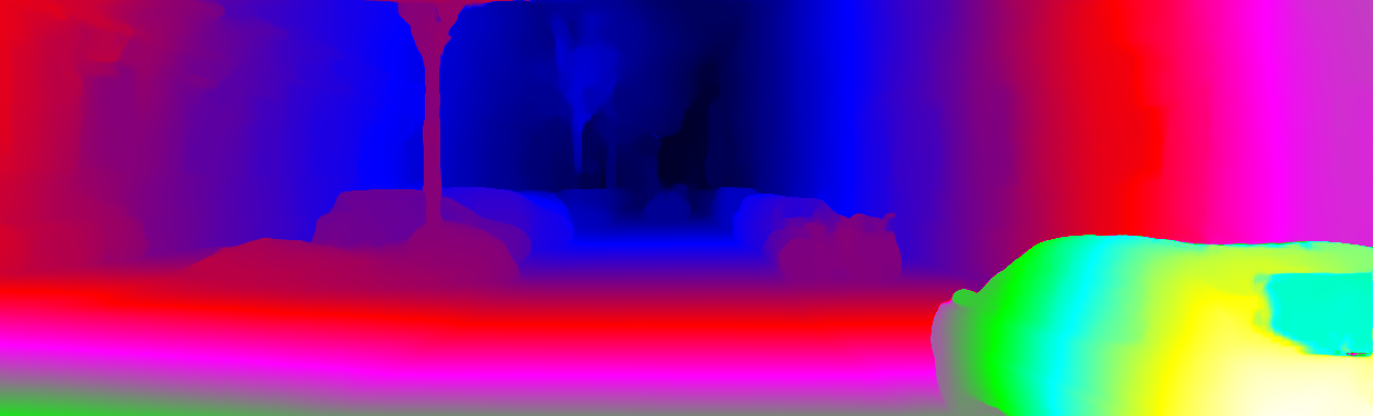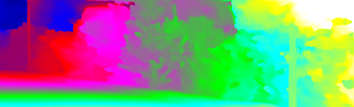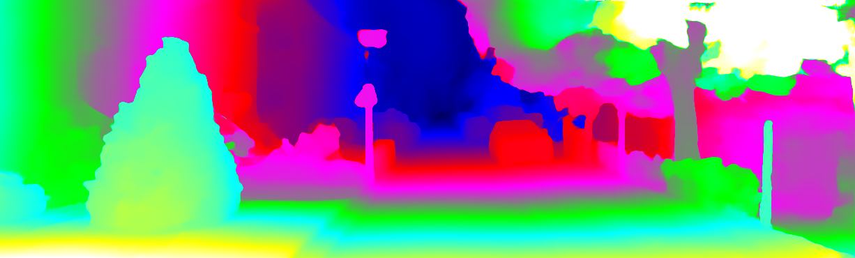 This page provides detailed results for the method(s) selected. For each of the first 20 test images, the number of erroneous pixels at all thresholds is depicted in the table. Underneath, the left input image, the disparity / end-point error map and the estimated (and interpolated) disparity / optical flow map are shown. The error map scales linearly between 0 (black) and >=5 (white) pixels error. Red denotes all occluded pixels, falling outside the image boundaries. The false color map is scaled to the largest ground truth disparity / flow value.