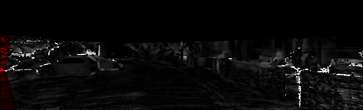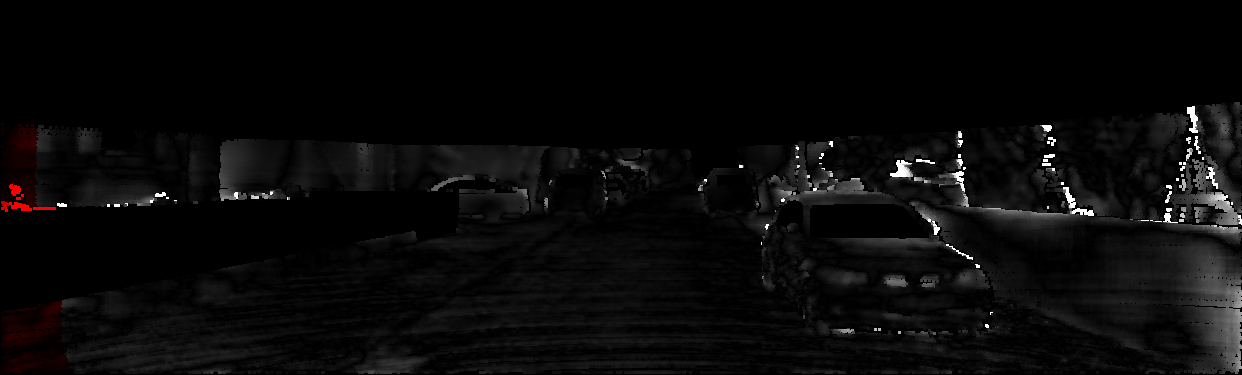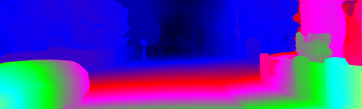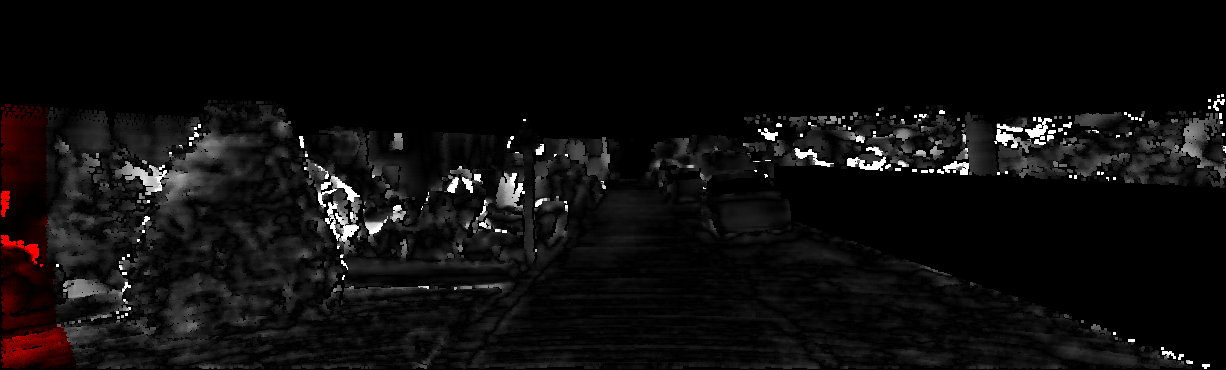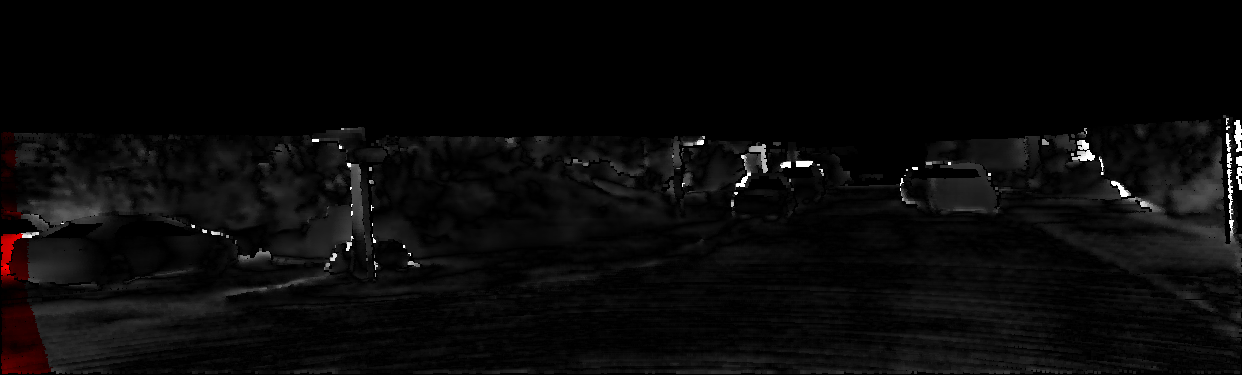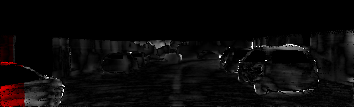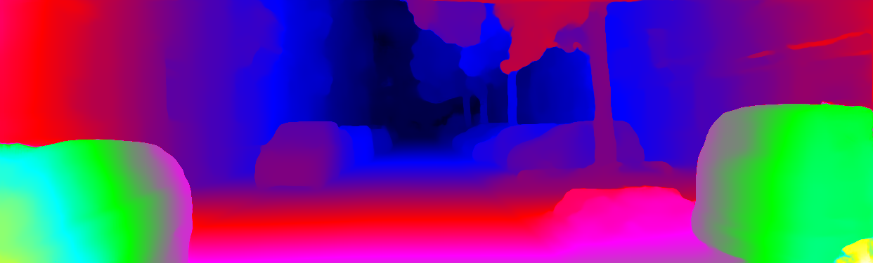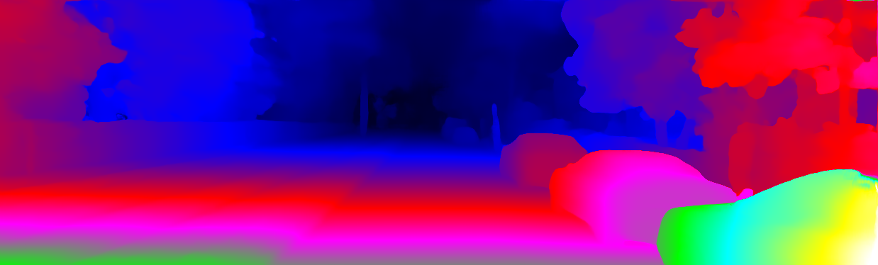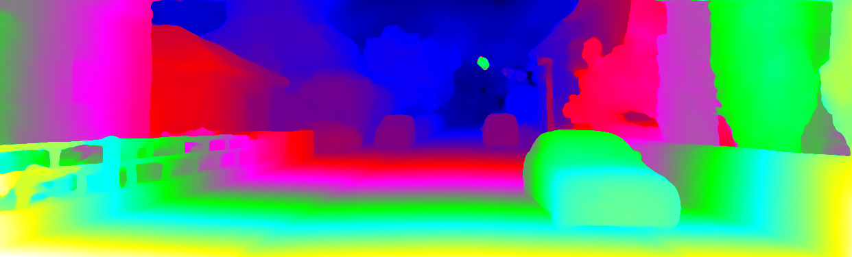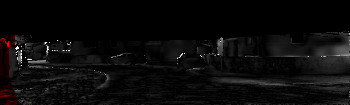This page provides detailed results for the method(s) selected. For each of the first 20 test images, the number of erroneous pixels at all thresholds is depicted in the table. Underneath, the left input image, the disparity / end-point error map and the estimated (and interpolated) disparity / optical flow map are shown. The error map scales linearly between 0 (black) and >=5 (white) pixels error. Red denotes all occluded pixels, falling outside the image boundaries. The false color map is scaled to the largest ground truth disparity / flow value.