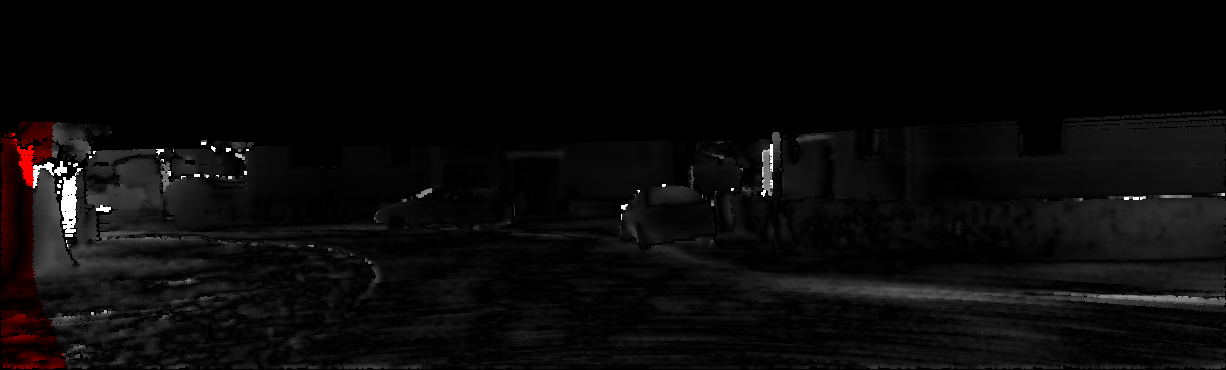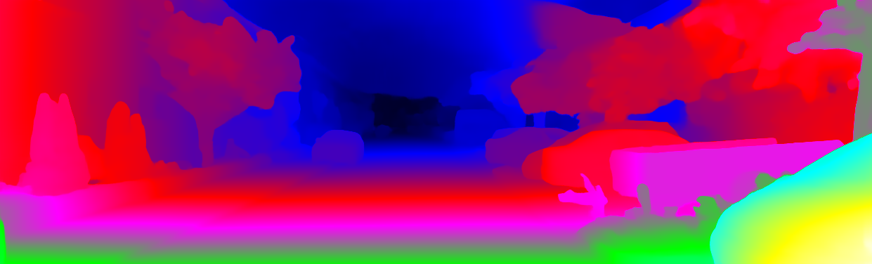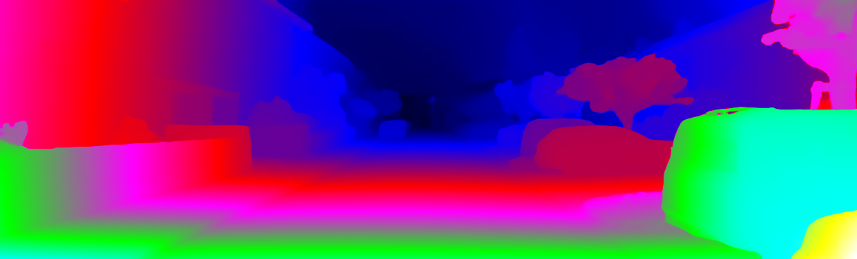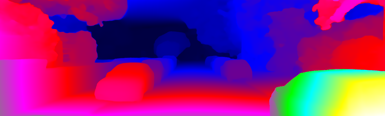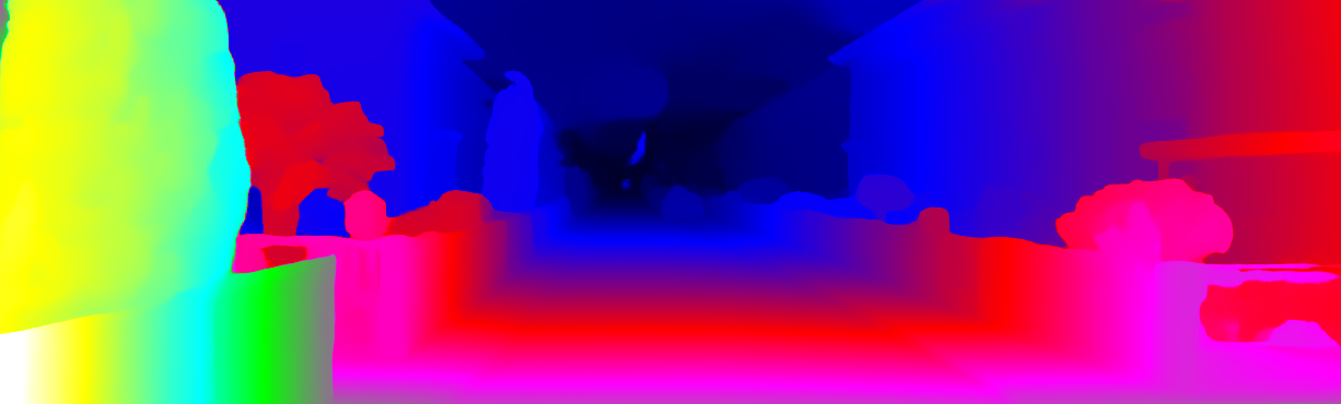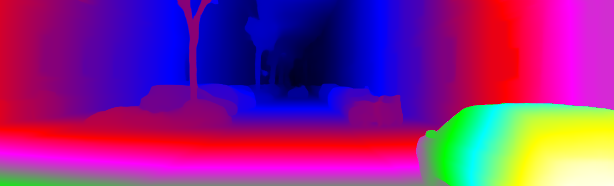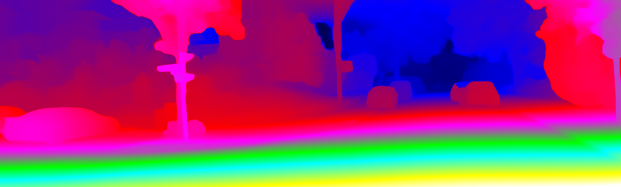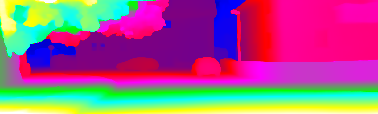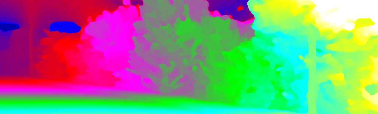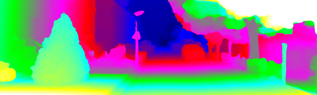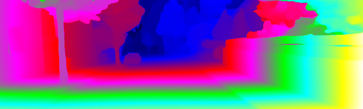 This page provides detailed results for the method(s) selected. For each of the first 20 test images, the number of erroneous pixels at all thresholds is depicted in the table. Underneath, the left input image, the disparity / end-point error map and the estimated (and interpolated) disparity / optical flow map are shown. The error map scales linearly between 0 (black) and >=5 (white) pixels error. Red denotes all occluded pixels, falling outside the image boundaries. The false color map is scaled to the largest ground truth disparity / flow value.
