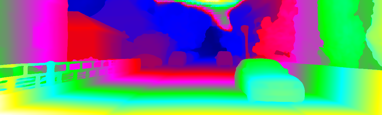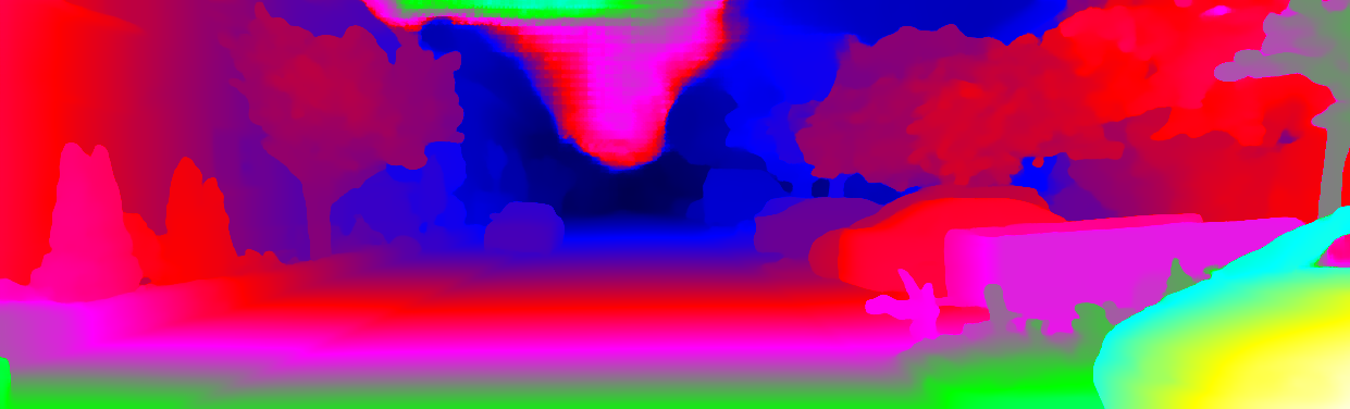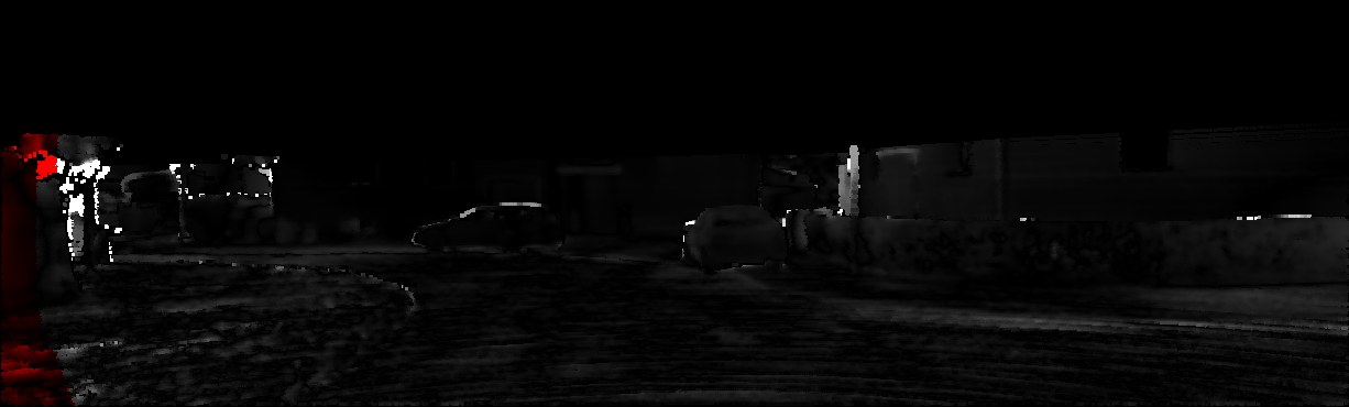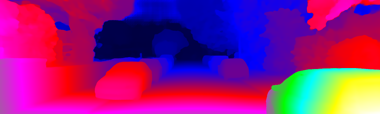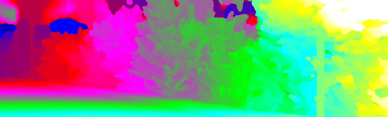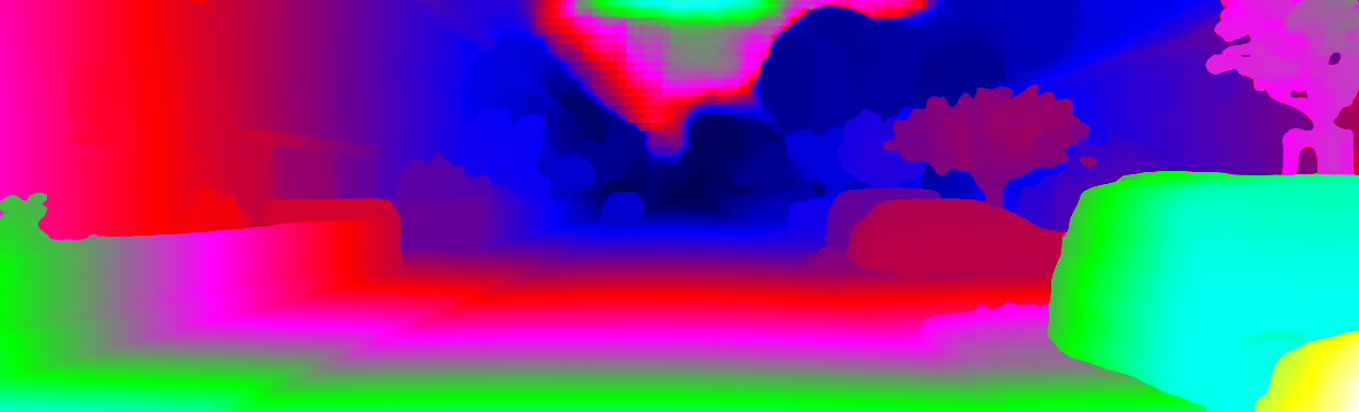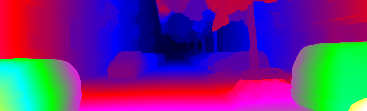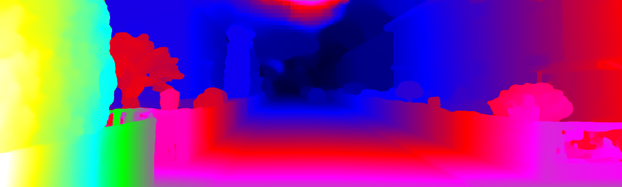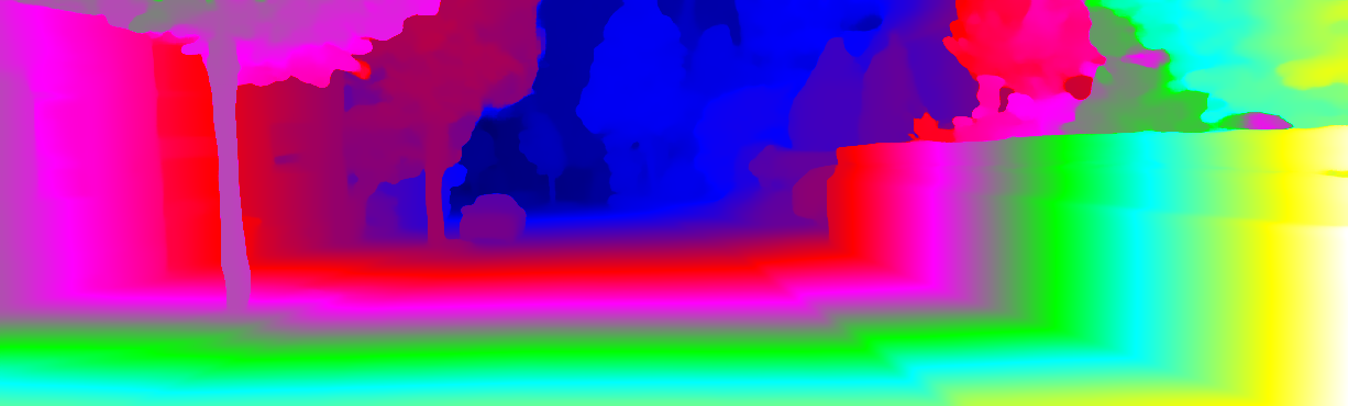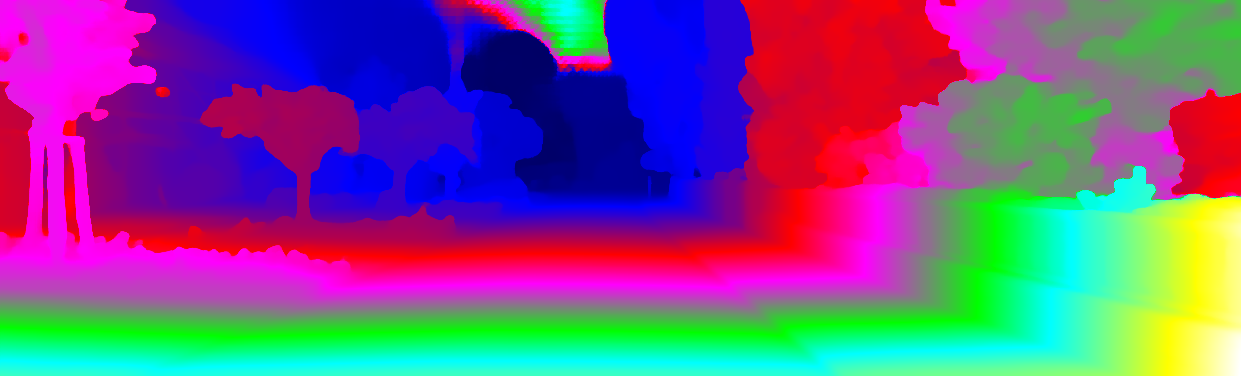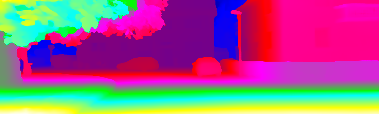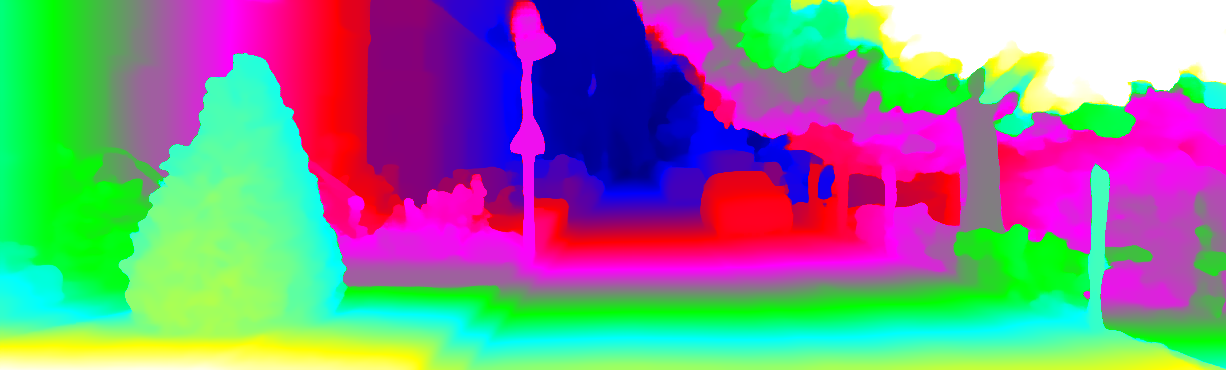 This page provides detailed results for the method(s) selected. For each of the first 20 test images, the number of erroneous pixels at all thresholds is depicted in the table. Underneath, the left input image, the disparity / end-point error map and the estimated (and interpolated) disparity / optical flow map are shown. The error map scales linearly between 0 (black) and >=5 (white) pixels error. Red denotes all occluded pixels, falling outside the image boundaries. The false color map is scaled to the largest ground truth disparity / flow value.