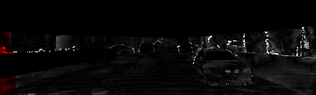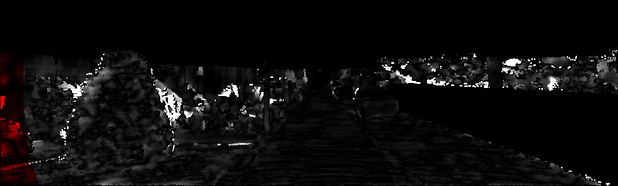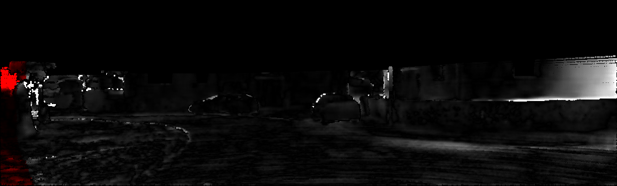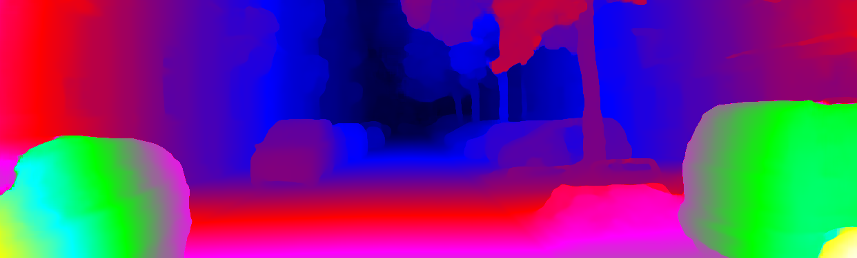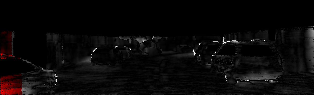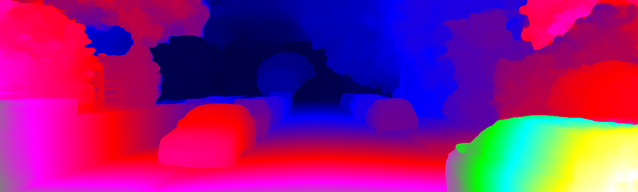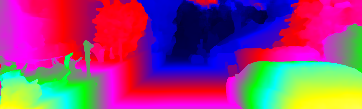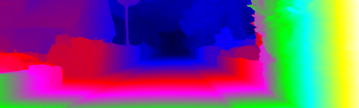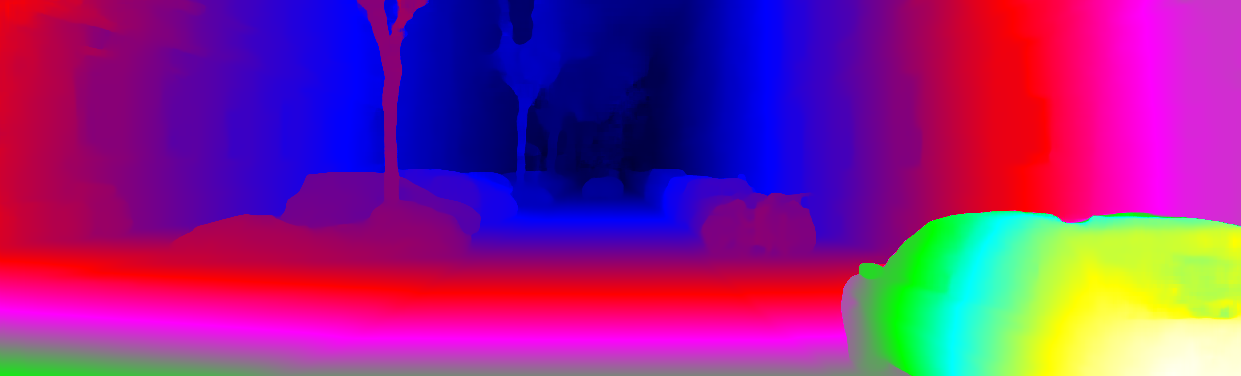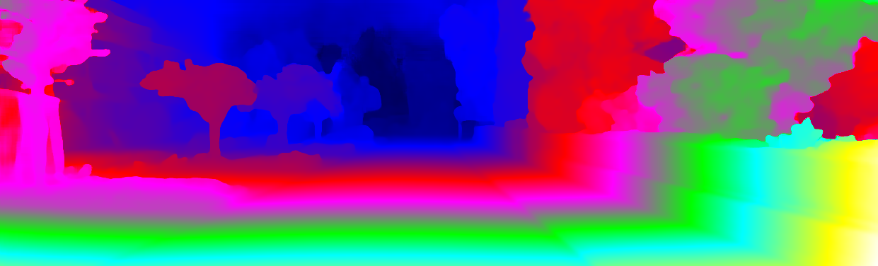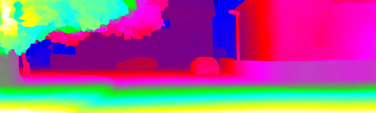 This page provides detailed results for the method(s) selected. For each of the first 20 test images, the number of erroneous pixels at all thresholds is depicted in the table. Underneath, the left input image, the disparity / end-point error map and the estimated (and interpolated) disparity / optical flow map are shown. The error map scales linearly between 0 (black) and >=5 (white) pixels error. Red denotes all occluded pixels, falling outside the image boundaries. The false color map is scaled to the largest ground truth disparity / flow value.