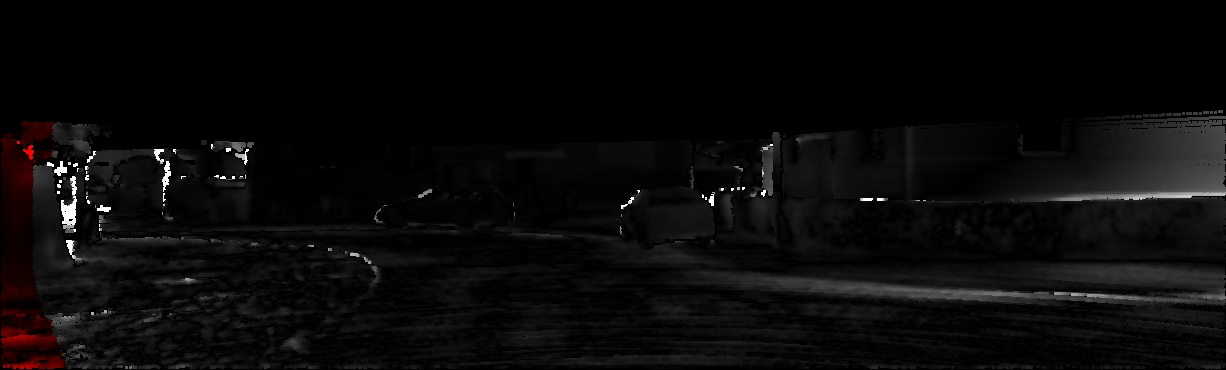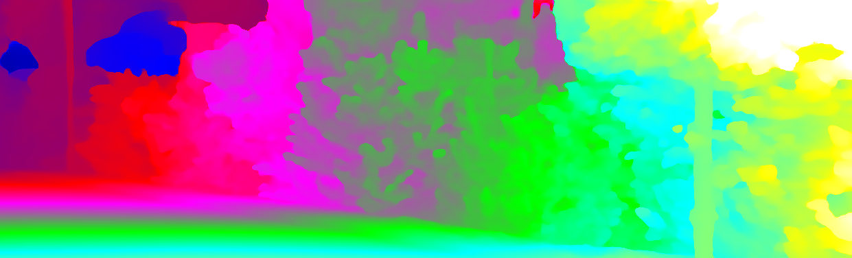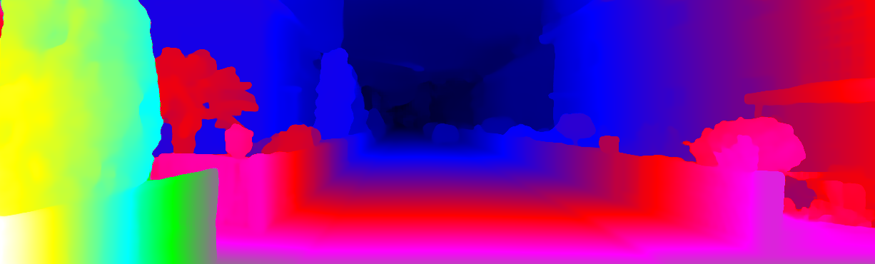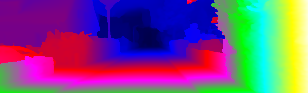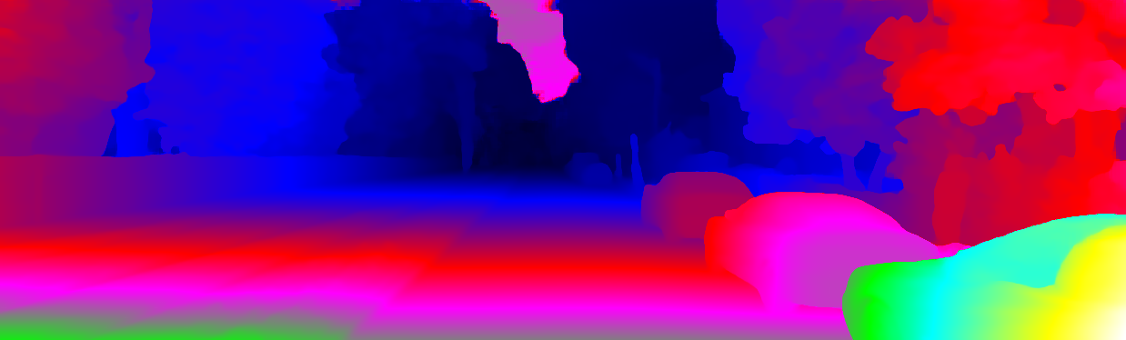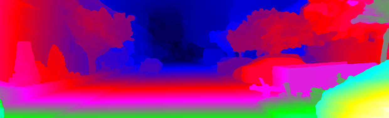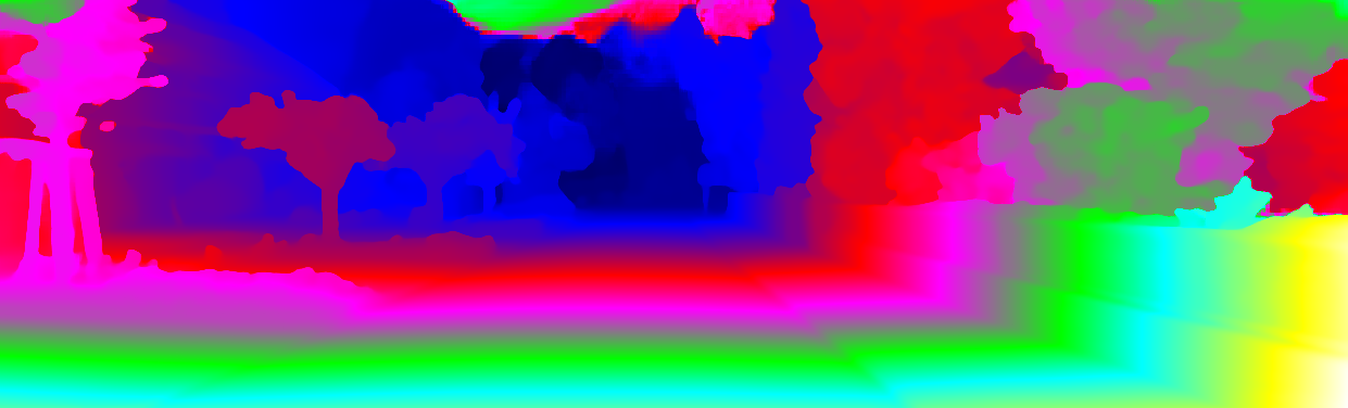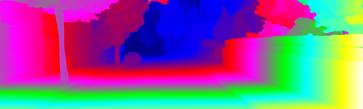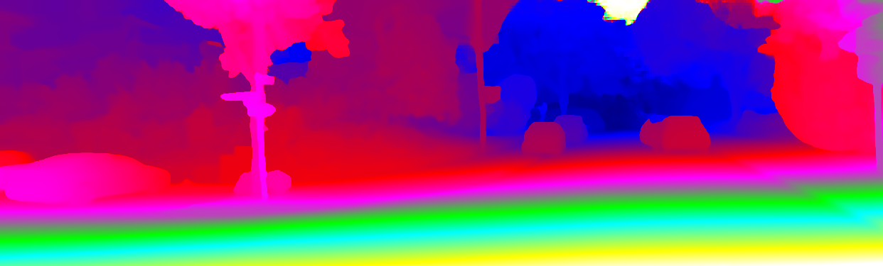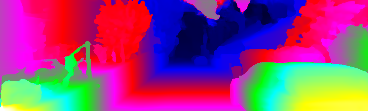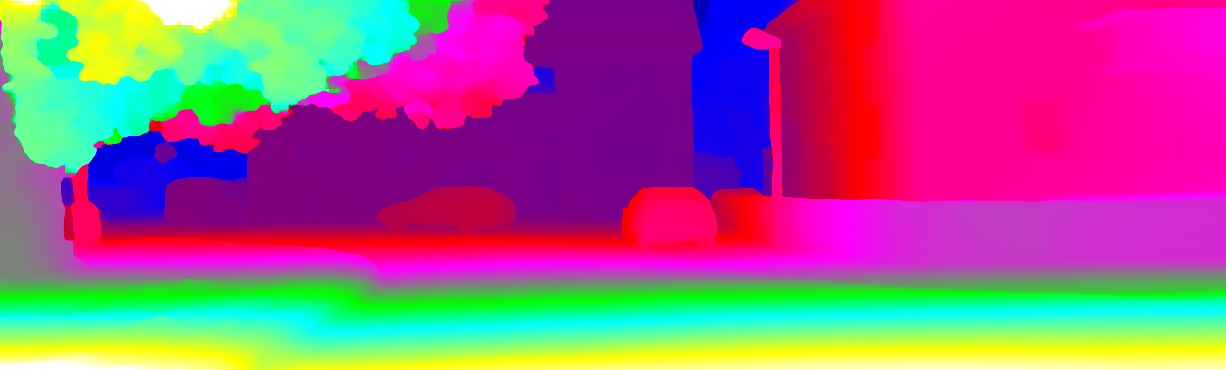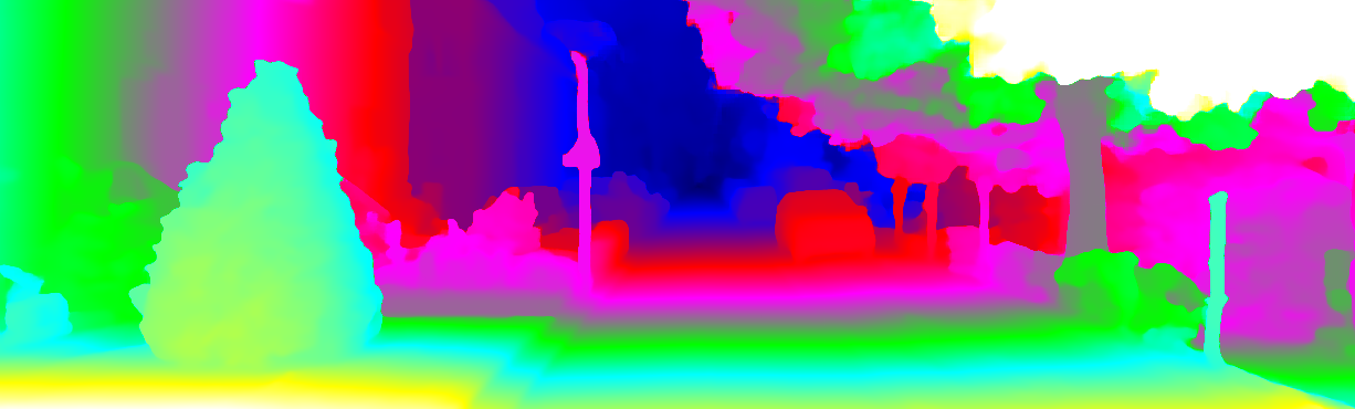 This page provides detailed results for the method(s) selected. For each of the first 20 test images, the number of erroneous pixels at all thresholds is depicted in the table. Underneath, the left input image, the disparity / end-point error map and the estimated (and interpolated) disparity / optical flow map are shown. The error map scales linearly between 0 (black) and >=5 (white) pixels error. Red denotes all occluded pixels, falling outside the image boundaries. The false color map is scaled to the largest ground truth disparity / flow value.