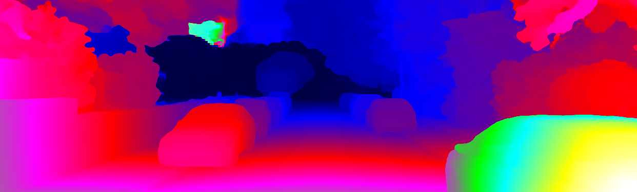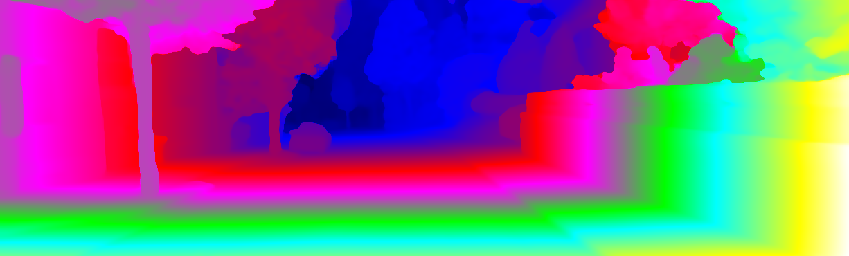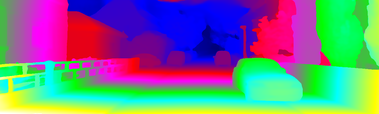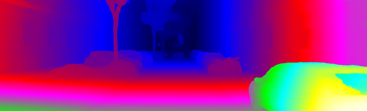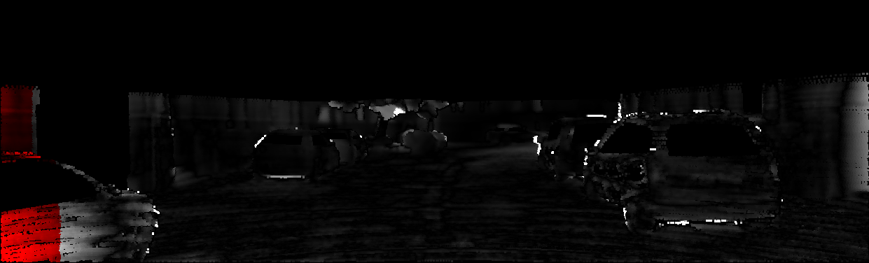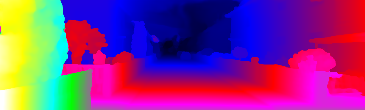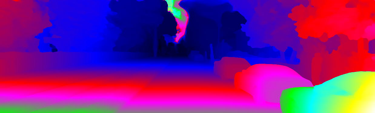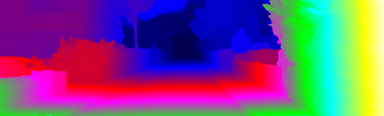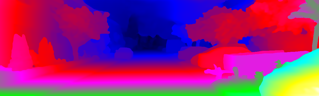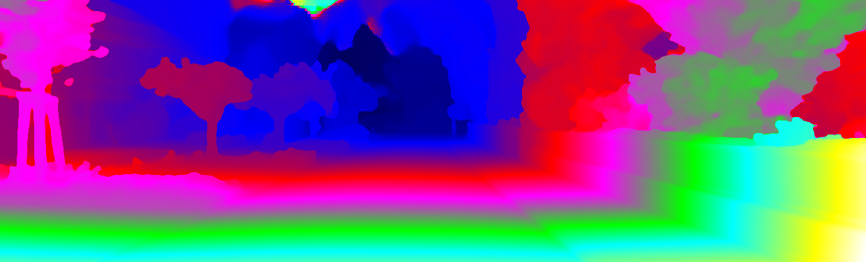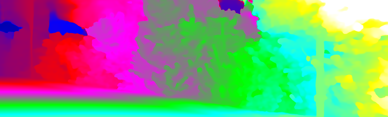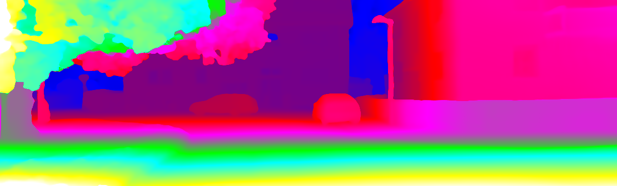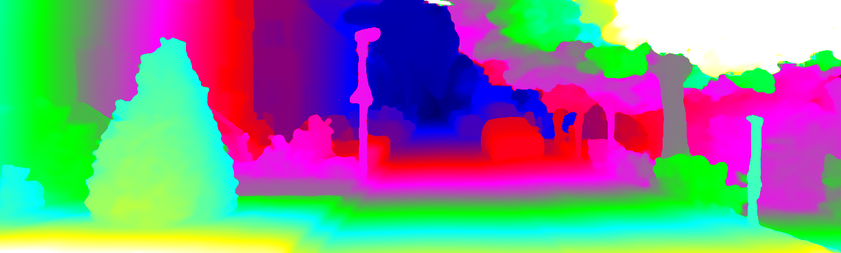 This page provides detailed results for the method(s) selected. For each of the first 20 test images, the number of erroneous pixels at all thresholds is depicted in the table. Underneath, the left input image, the disparity / end-point error map and the estimated (and interpolated) disparity / optical flow map are shown. The error map scales linearly between 0 (black) and >=5 (white) pixels error. Red denotes all occluded pixels, falling outside the image boundaries. The false color map is scaled to the largest ground truth disparity / flow value.