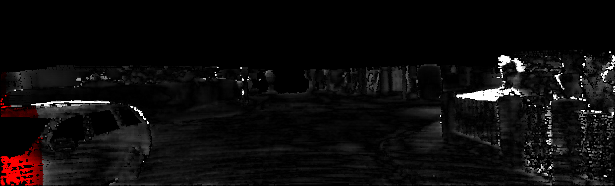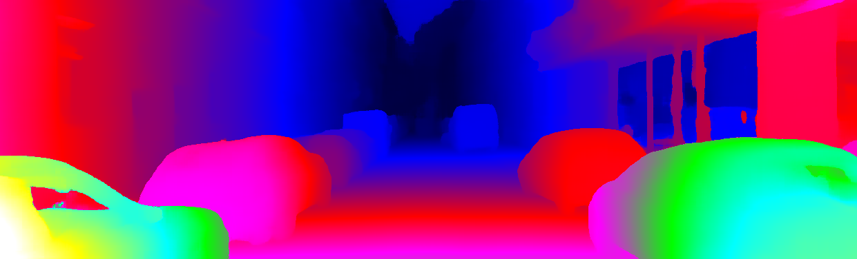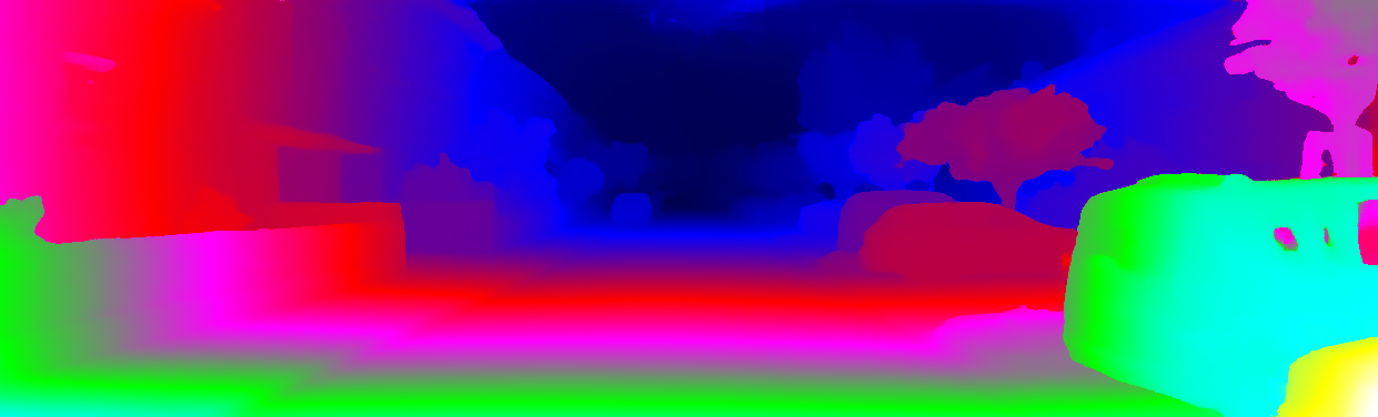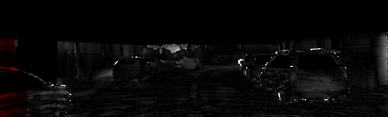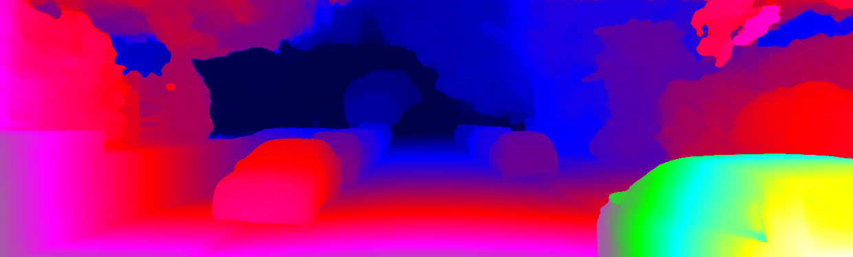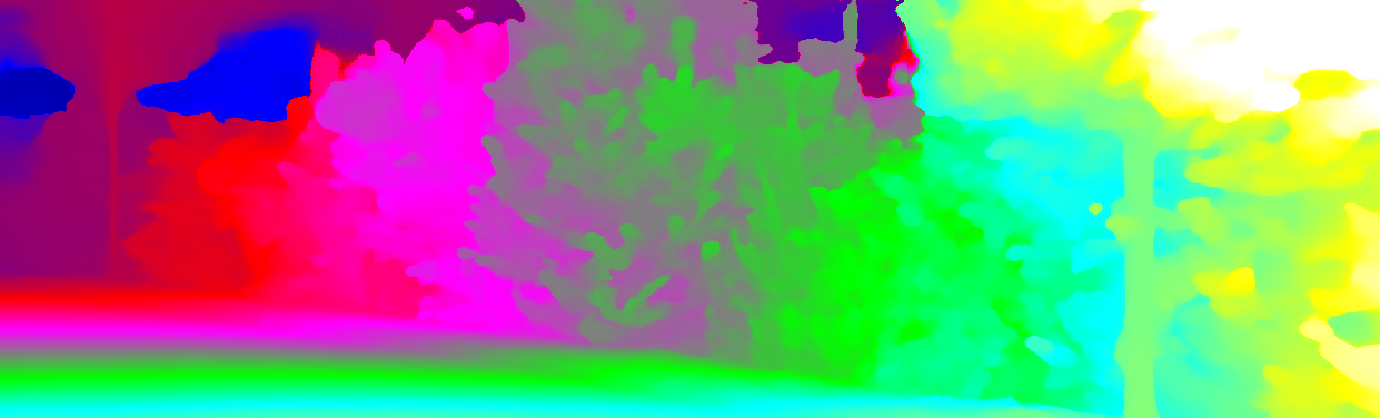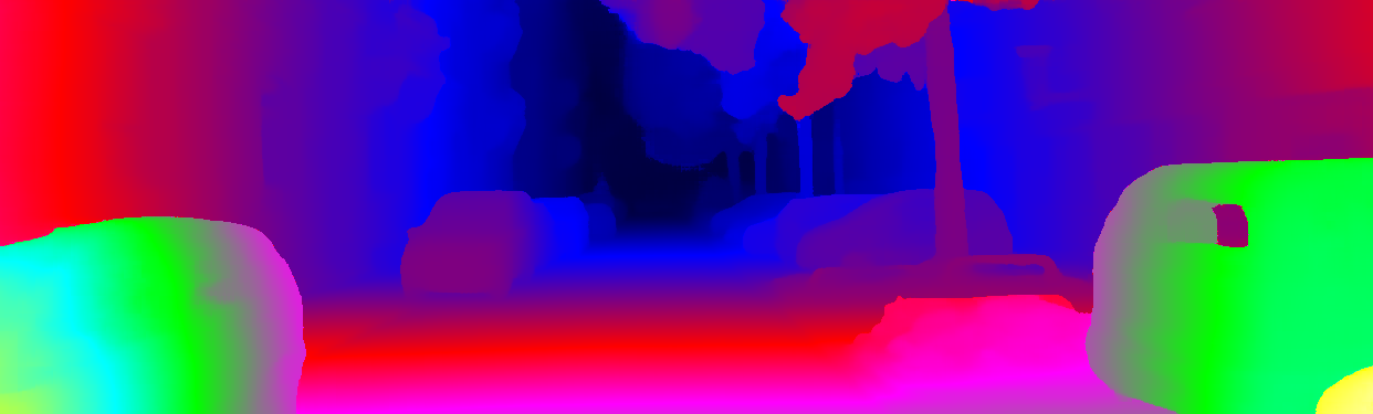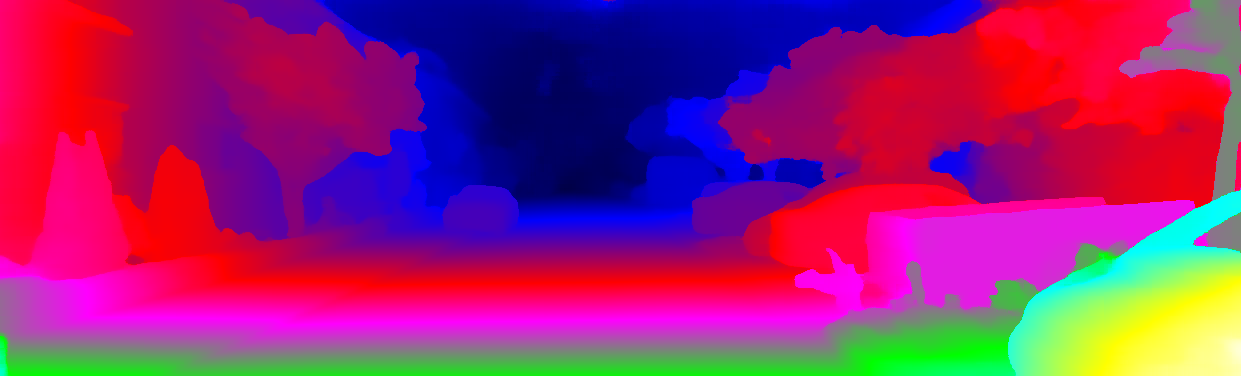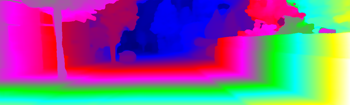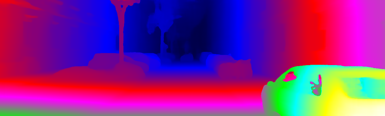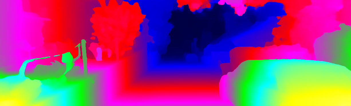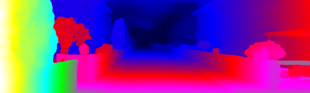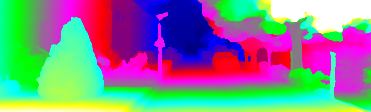 This page provides detailed results for the method(s) selected. For each of the first 20 test images, the number of erroneous pixels at all thresholds is depicted in the table. Underneath, the left input image, the disparity / end-point error map and the estimated (and interpolated) disparity / optical flow map are shown. The error map scales linearly between 0 (black) and >=5 (white) pixels error. Red denotes all occluded pixels, falling outside the image boundaries. The false color map is scaled to the largest ground truth disparity / flow value.
