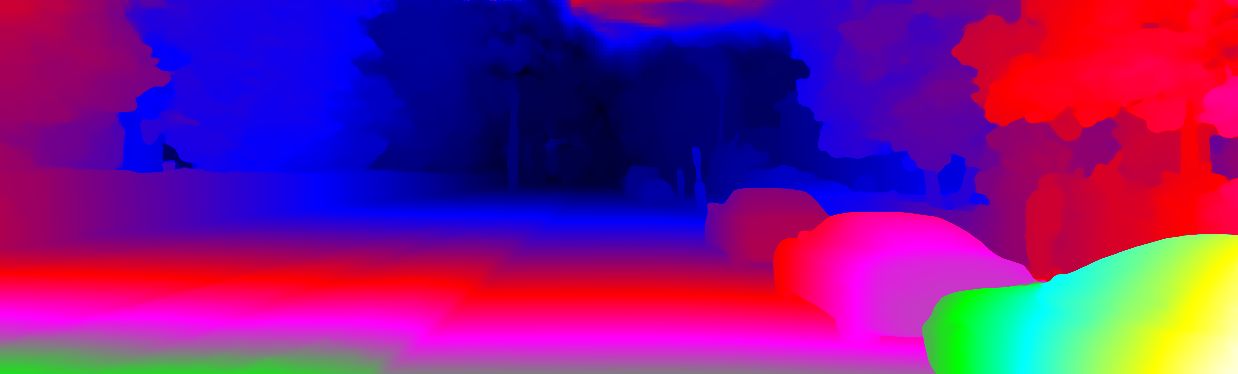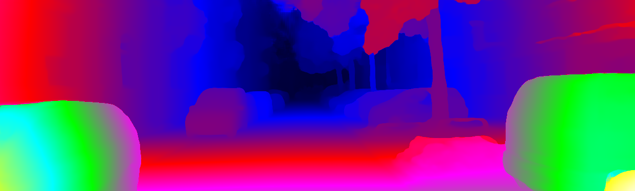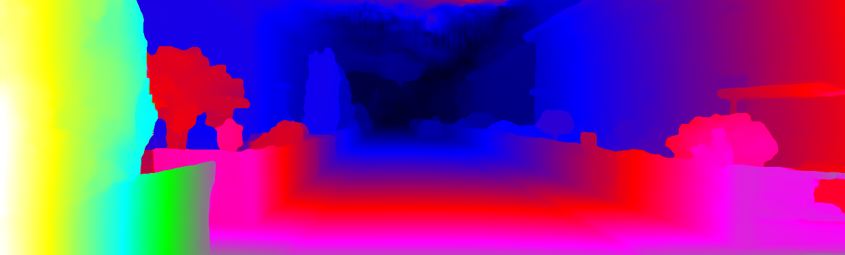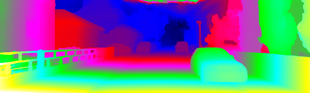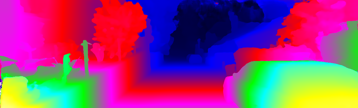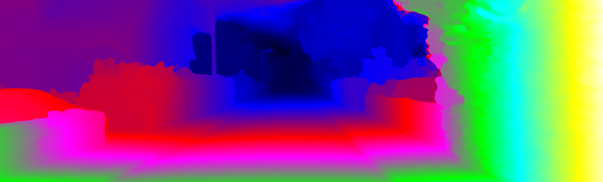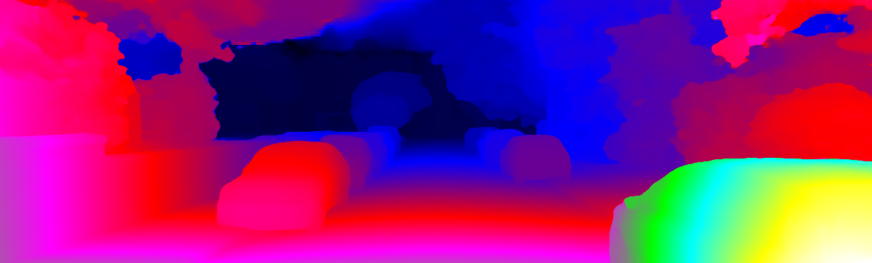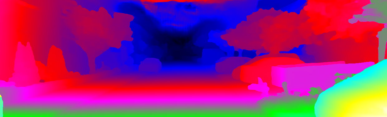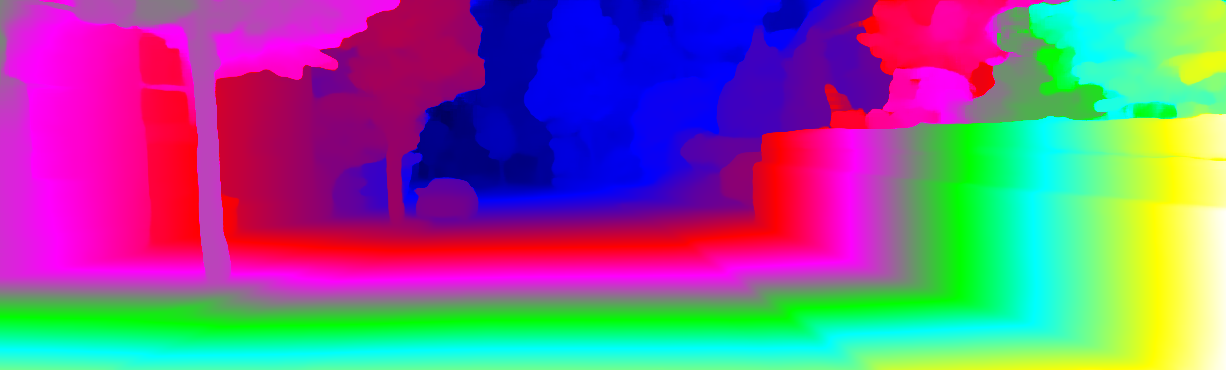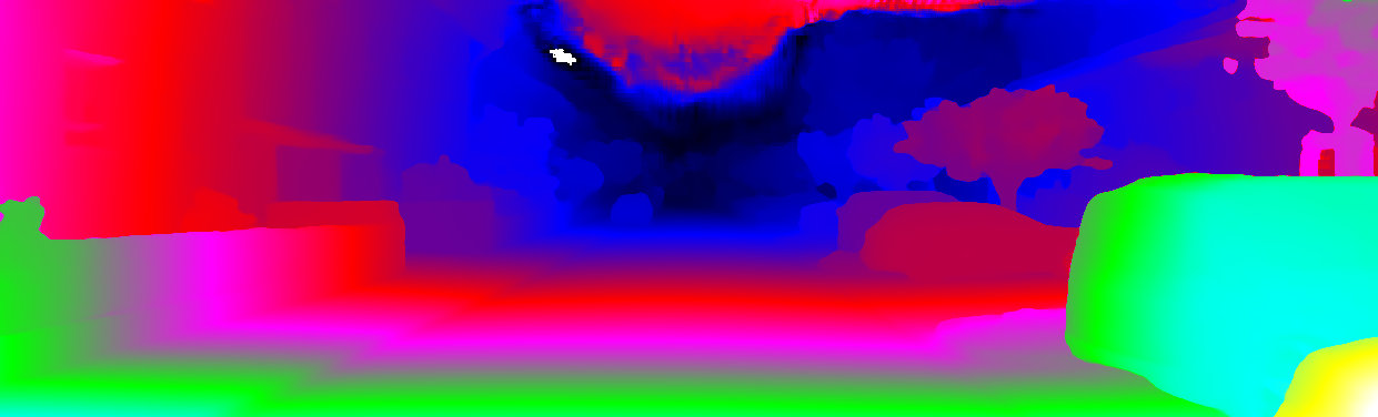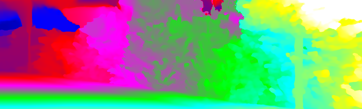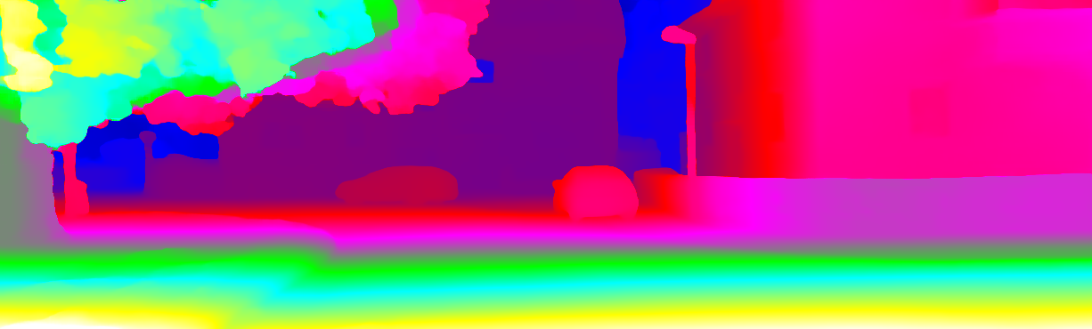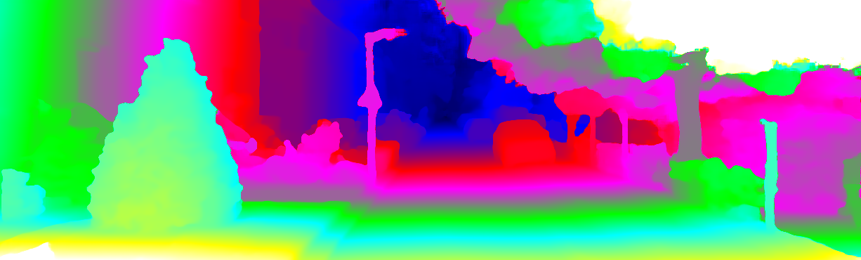 This page provides detailed results for the method(s) selected. For each of the first 20 test images, the number of erroneous pixels at all thresholds is depicted in the table. Underneath, the left input image, the disparity / end-point error map and the estimated (and interpolated) disparity / optical flow map are shown. The error map scales linearly between 0 (black) and >=5 (white) pixels error. Red denotes all occluded pixels, falling outside the image boundaries. The false color map is scaled to the largest ground truth disparity / flow value.