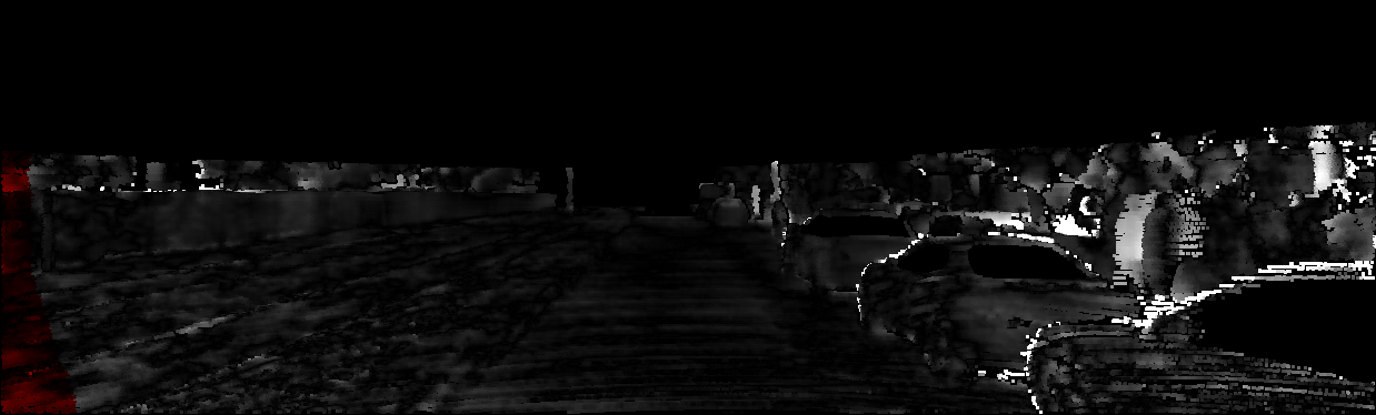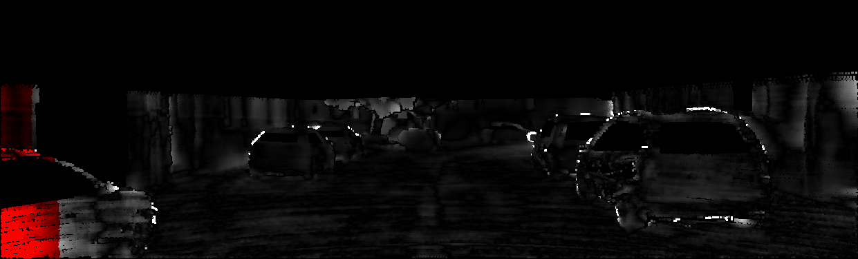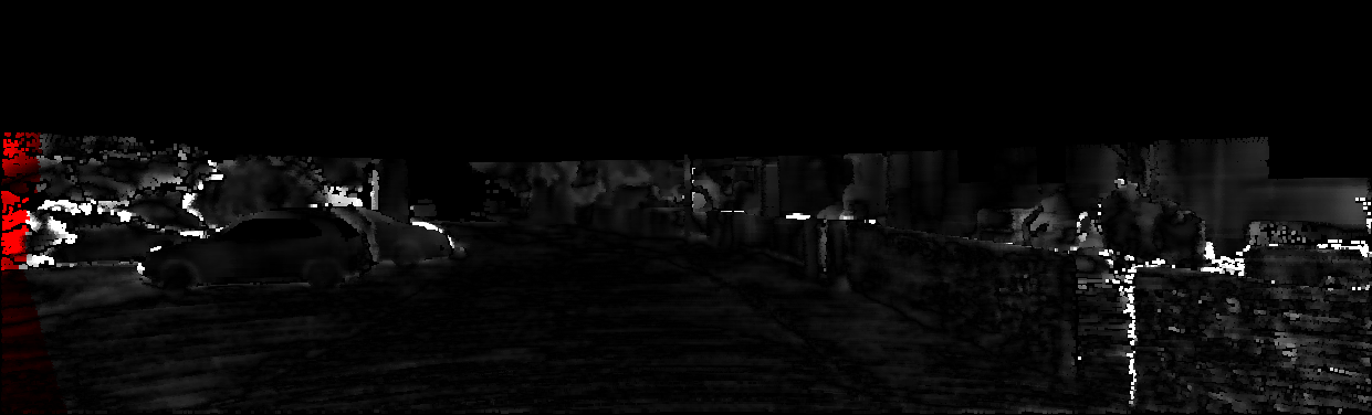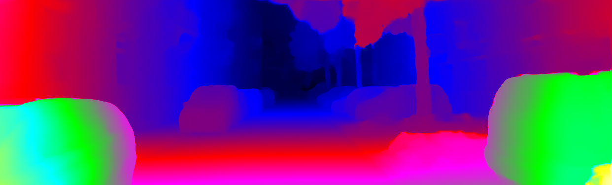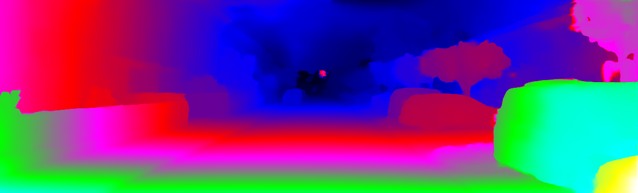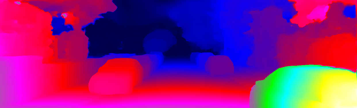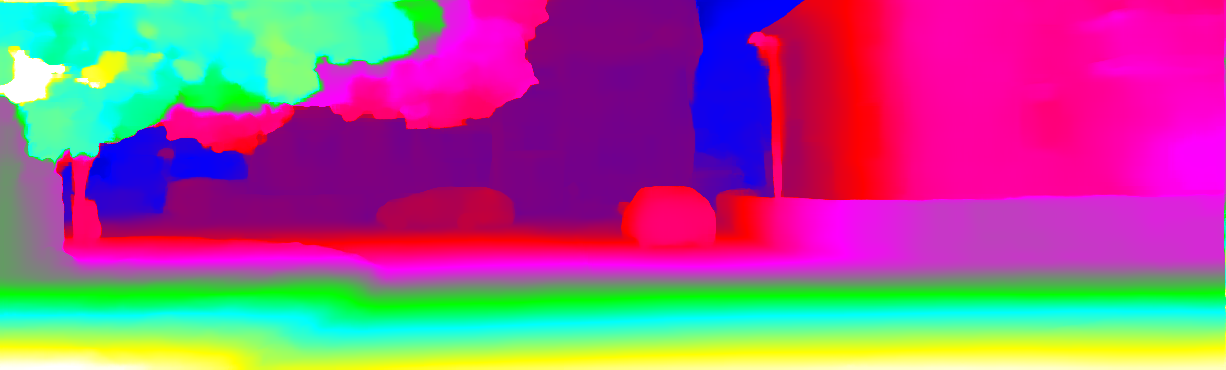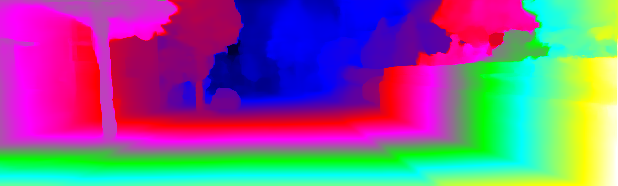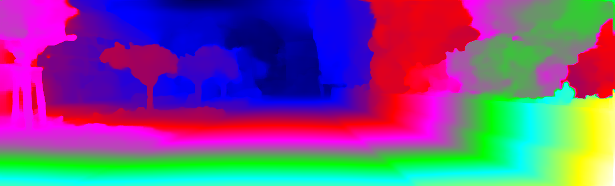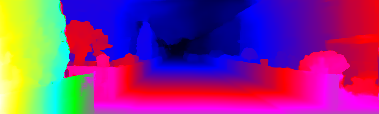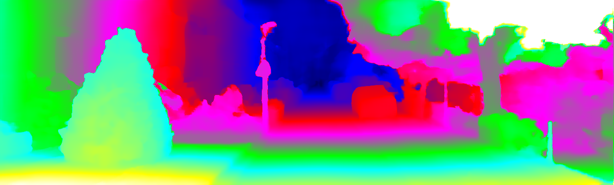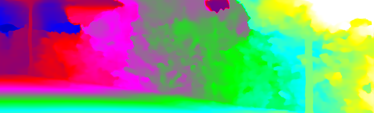 This page provides detailed results for the method(s) selected. For each of the first 20 test images, the number of erroneous pixels at all thresholds is depicted in the table. Underneath, the left input image, the disparity / end-point error map and the estimated (and interpolated) disparity / optical flow map are shown. The error map scales linearly between 0 (black) and >=5 (white) pixels error. Red denotes all occluded pixels, falling outside the image boundaries. The false color map is scaled to the largest ground truth disparity / flow value.