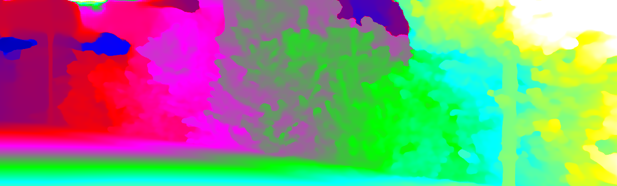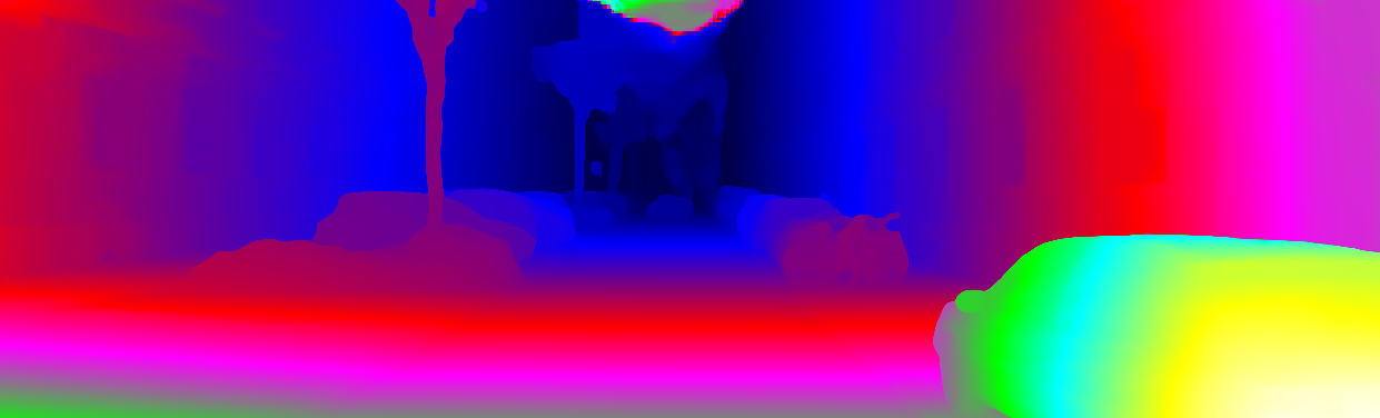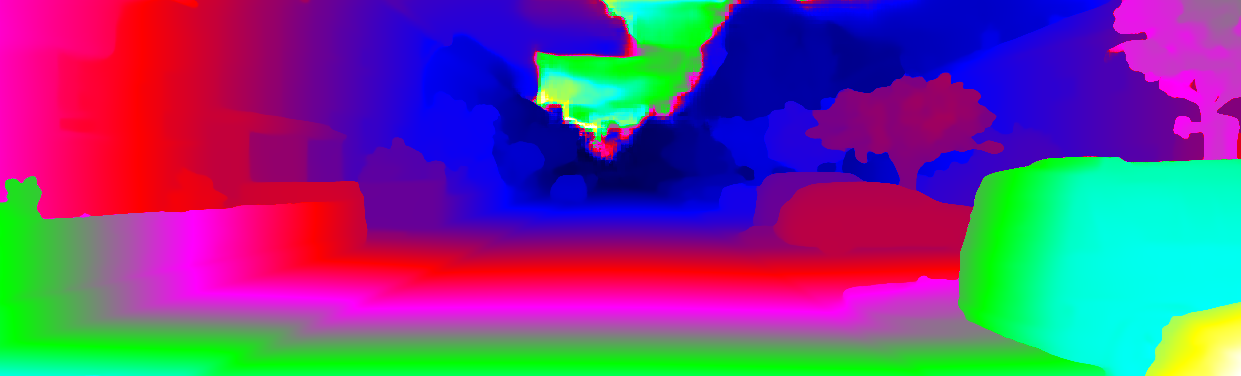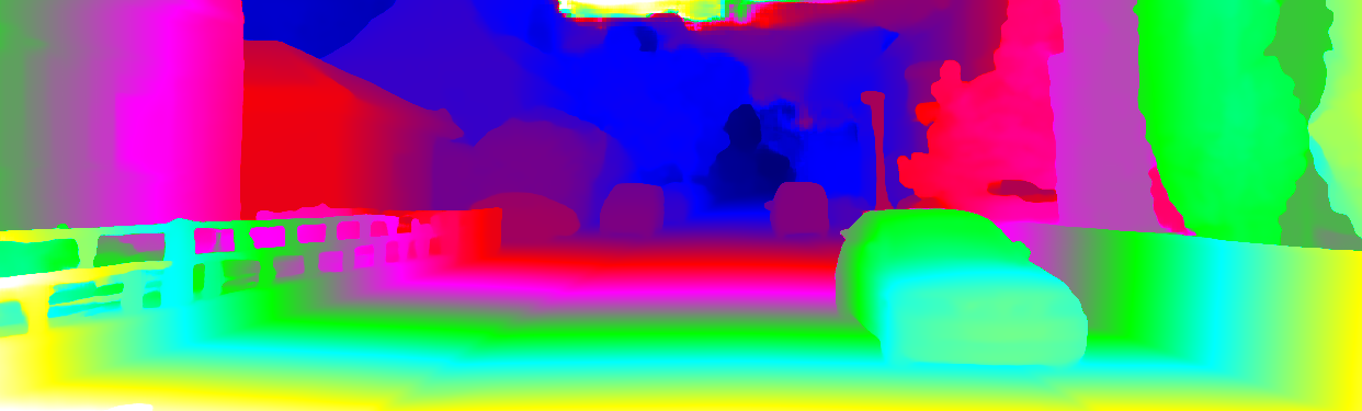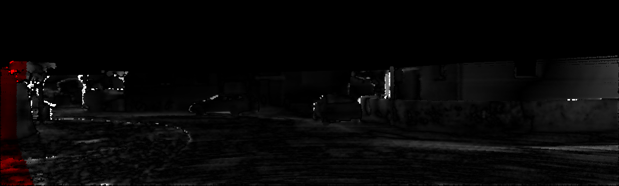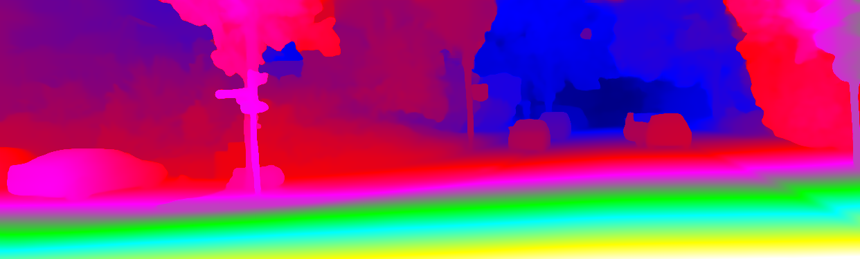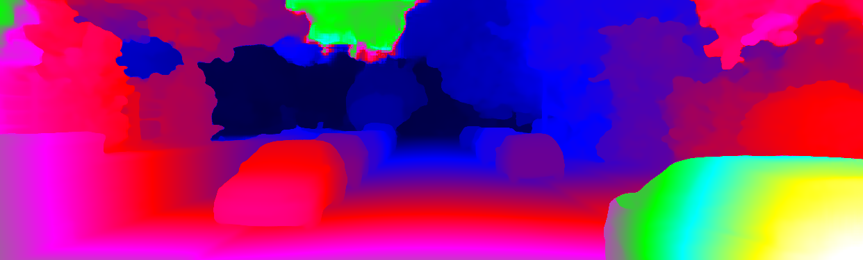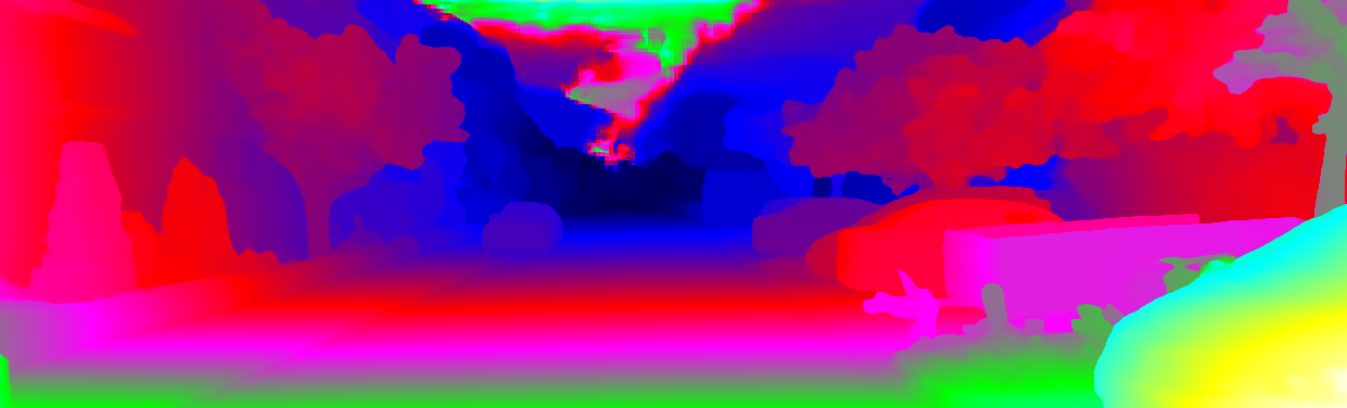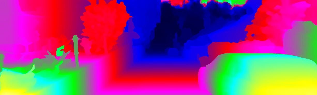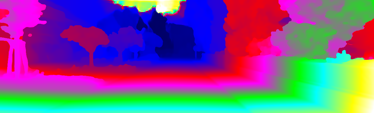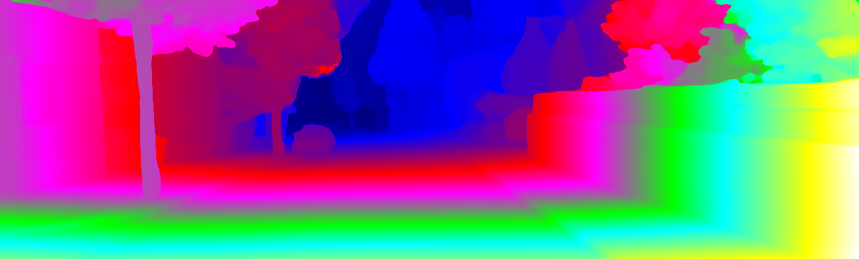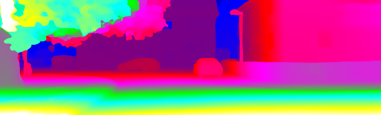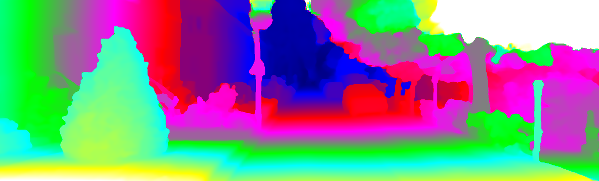 This page provides detailed results for the method(s) selected. For each of the first 20 test images, the number of erroneous pixels at all thresholds is depicted in the table. Underneath, the left input image, the disparity / end-point error map and the estimated (and interpolated) disparity / optical flow map are shown. The error map scales linearly between 0 (black) and >=5 (white) pixels error. Red denotes all occluded pixels, falling outside the image boundaries. The false color map is scaled to the largest ground truth disparity / flow value.