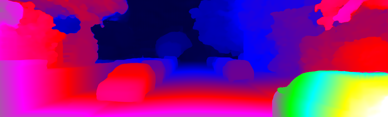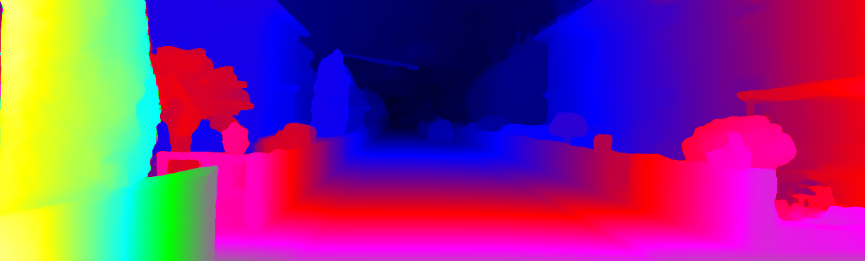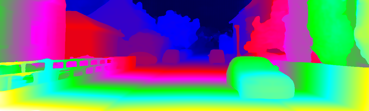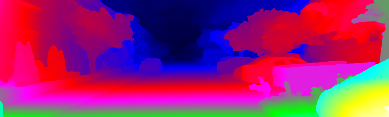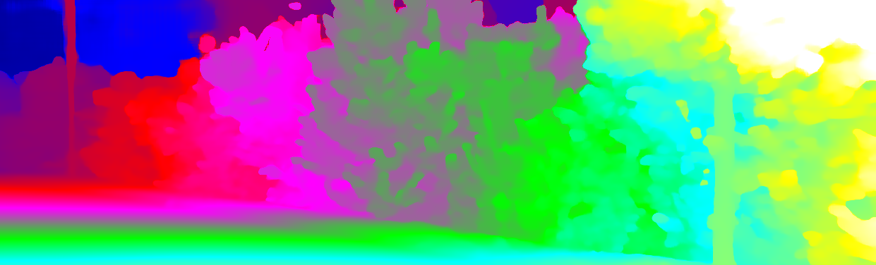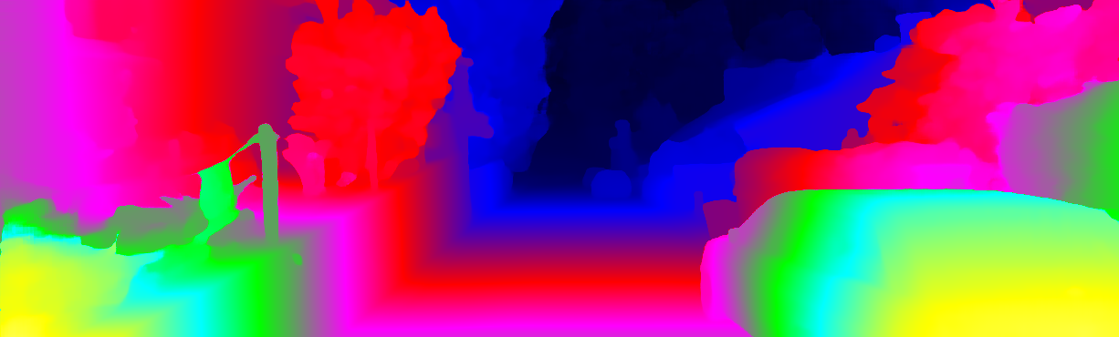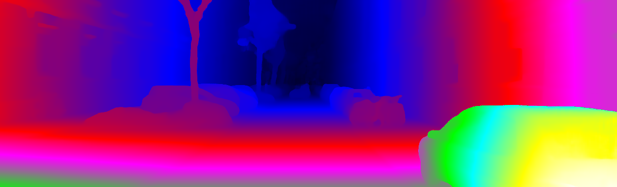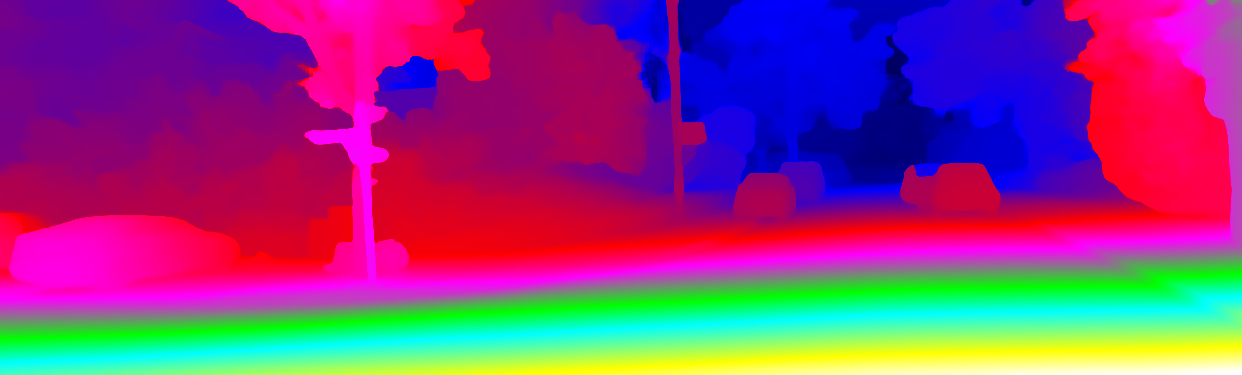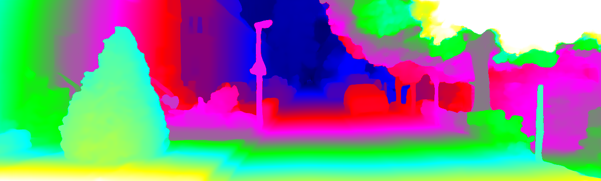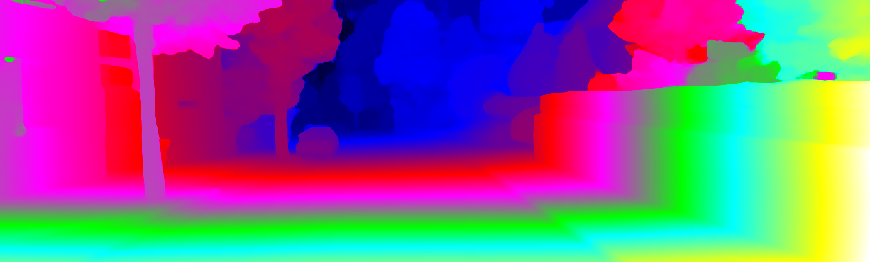 This page provides detailed results for the method(s) selected. For each of the first 20 test images, the number of erroneous pixels at all thresholds is depicted in the table. Underneath, the left input image, the disparity / end-point error map and the estimated (and interpolated) disparity / optical flow map are shown. The error map scales linearly between 0 (black) and >=5 (white) pixels error. Red denotes all occluded pixels, falling outside the image boundaries. The false color map is scaled to the largest ground truth disparity / flow value.