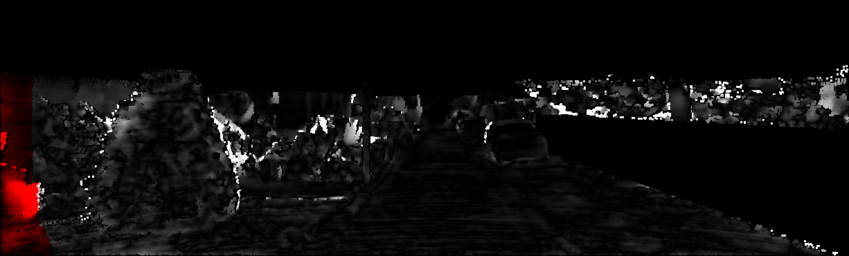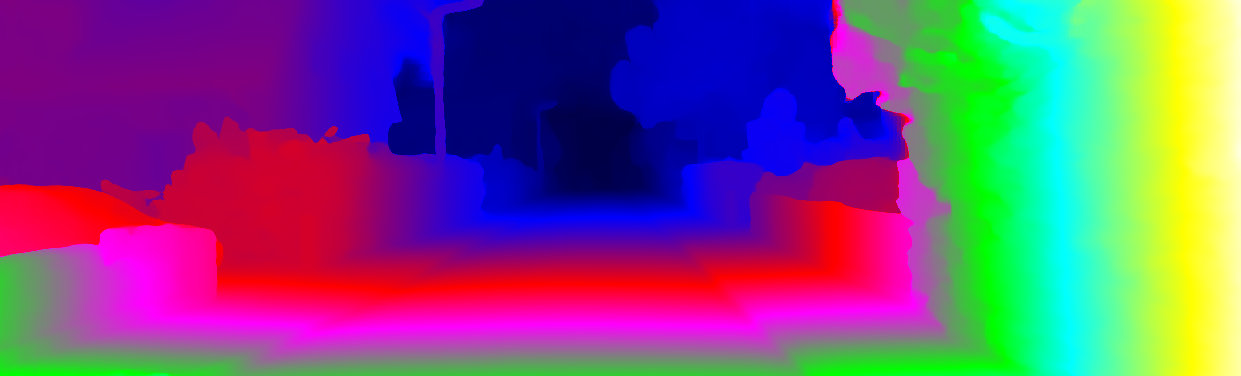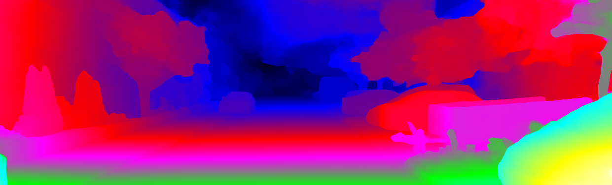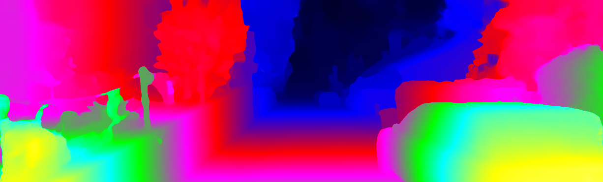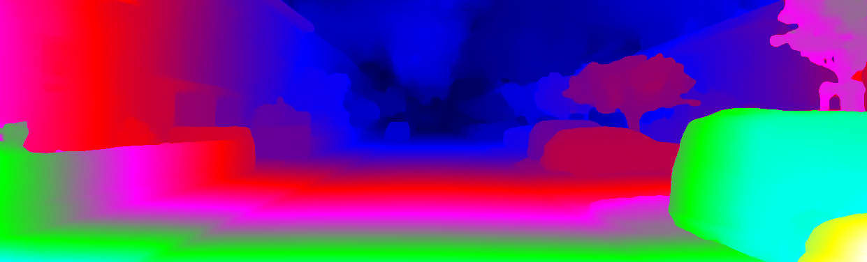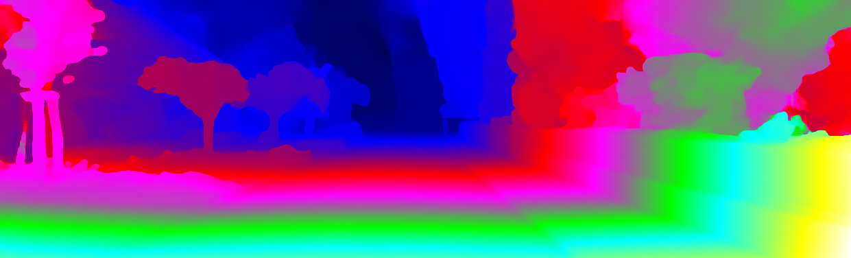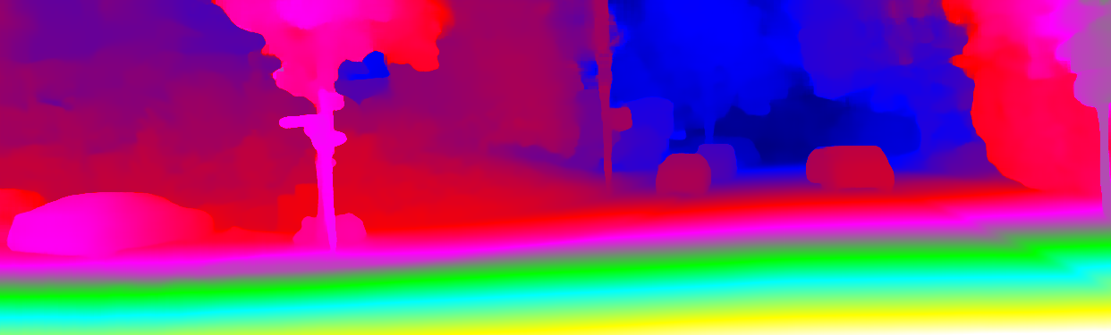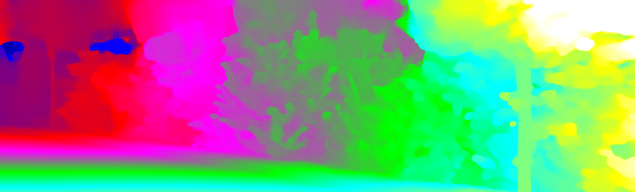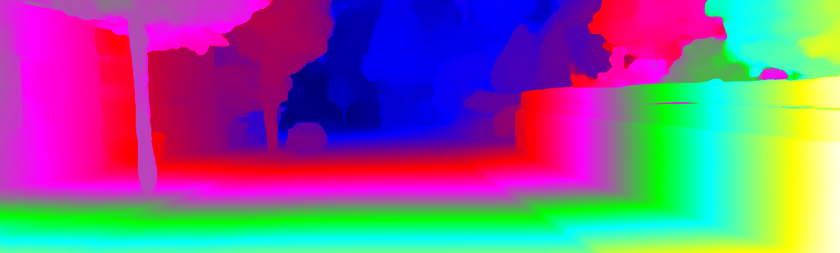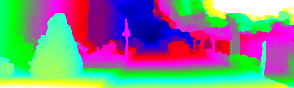 This page provides detailed results for the method(s) selected. For each of the first 20 test images, the number of erroneous pixels at all thresholds is depicted in the table. Underneath, the left input image, the disparity / end-point error map and the estimated (and interpolated) disparity / optical flow map are shown. The error map scales linearly between 0 (black) and >=5 (white) pixels error. Red denotes all occluded pixels, falling outside the image boundaries. The false color map is scaled to the largest ground truth disparity / flow value.