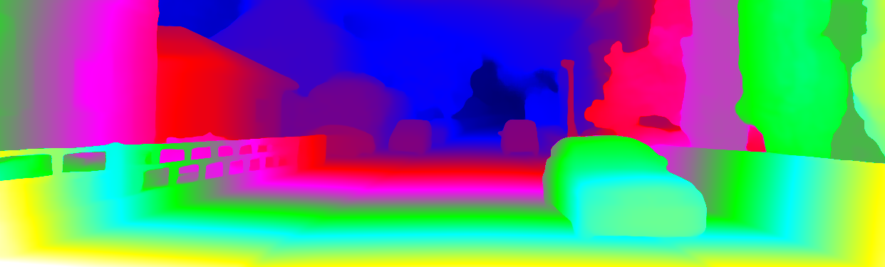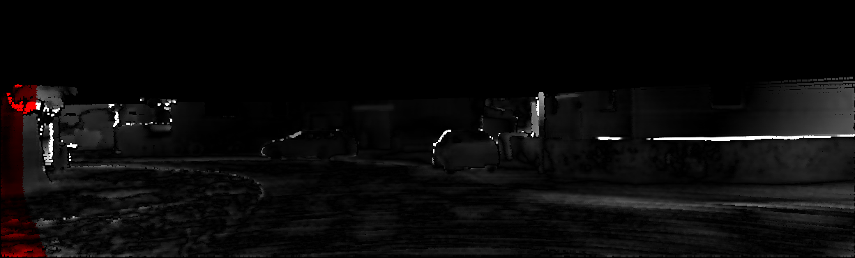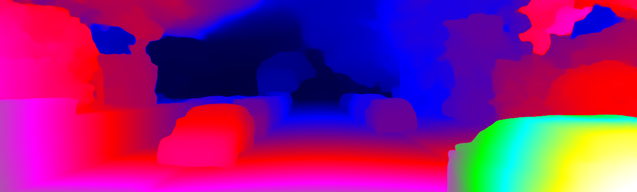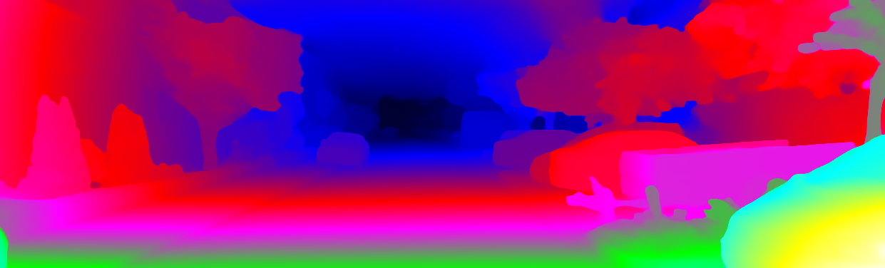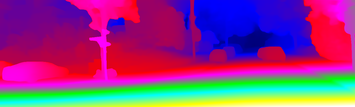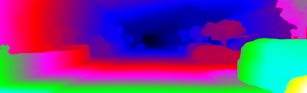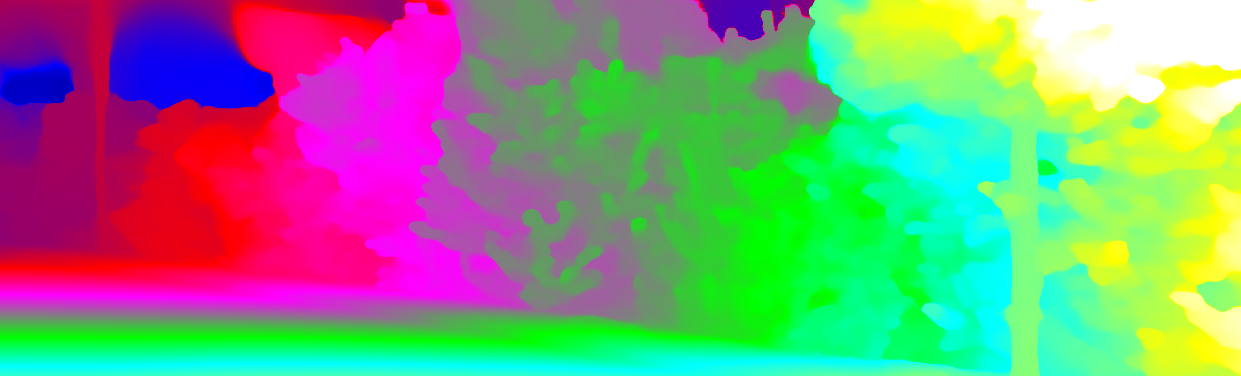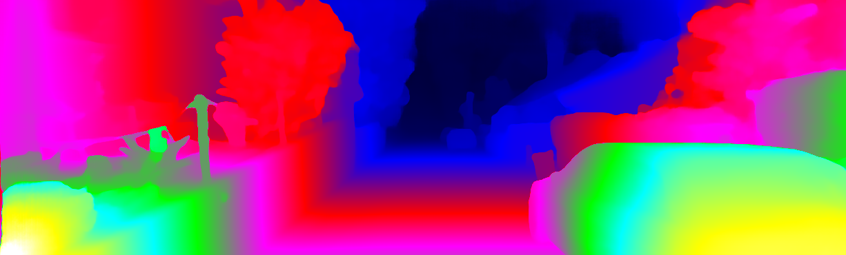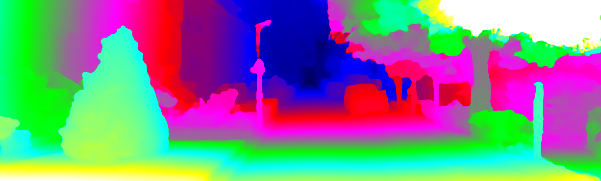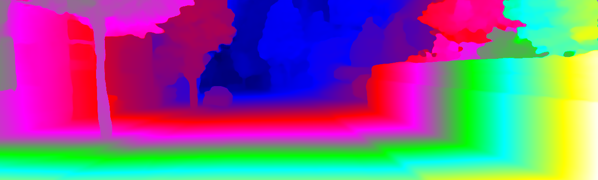 This page provides detailed results for the method(s) selected. For each of the first 20 test images, the number of erroneous pixels at all thresholds is depicted in the table. Underneath, the left input image, the disparity / end-point error map and the estimated (and interpolated) disparity / optical flow map are shown. The error map scales linearly between 0 (black) and >=5 (white) pixels error. Red denotes all occluded pixels, falling outside the image boundaries. The false color map is scaled to the largest ground truth disparity / flow value.