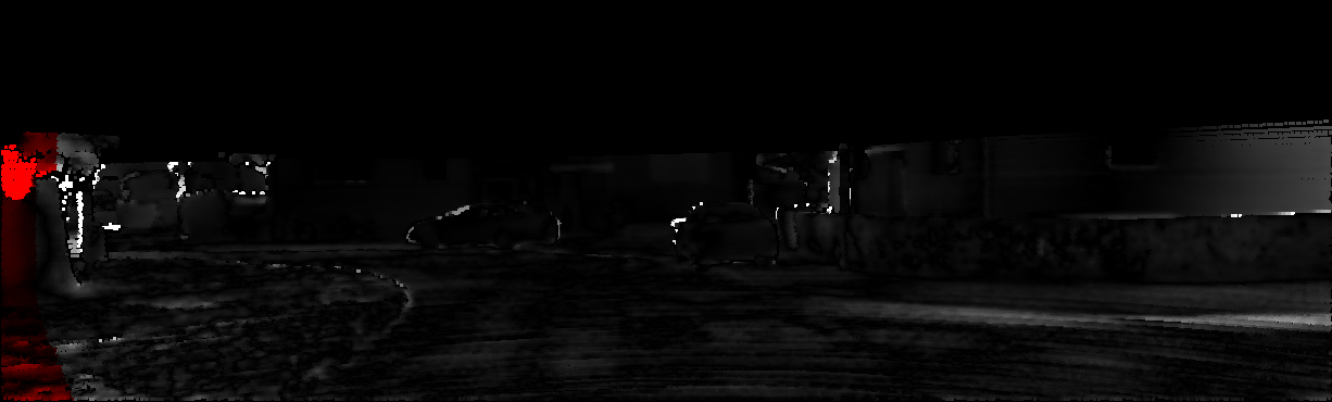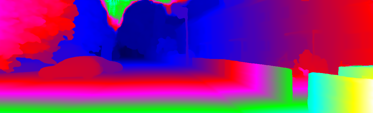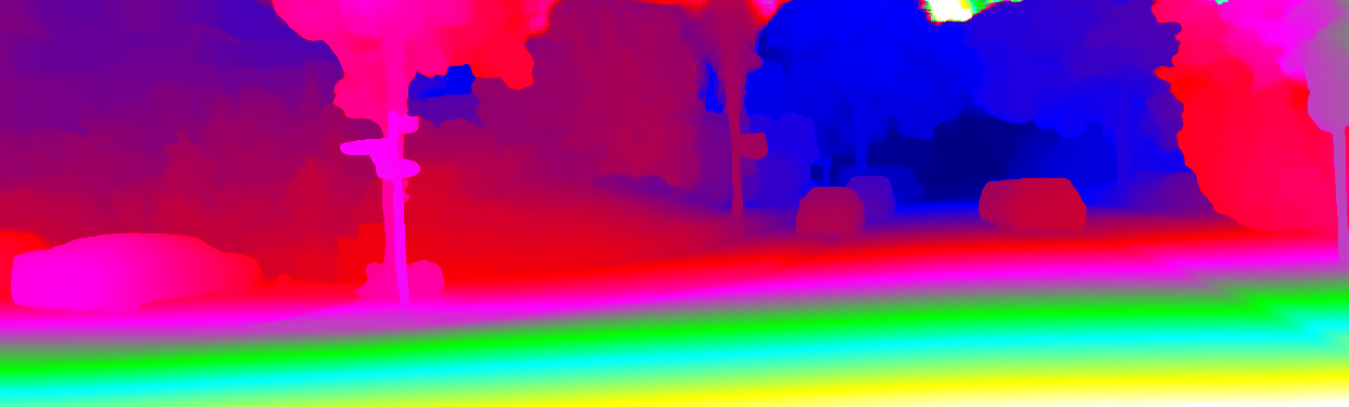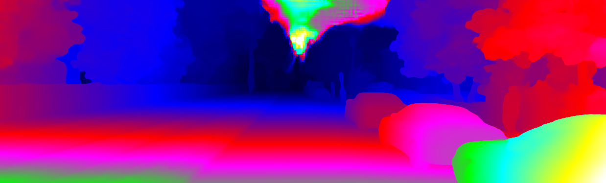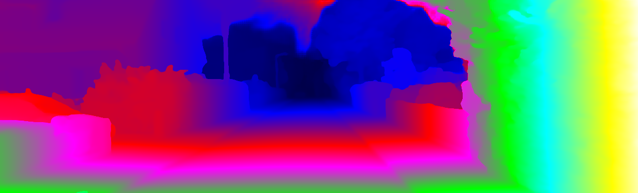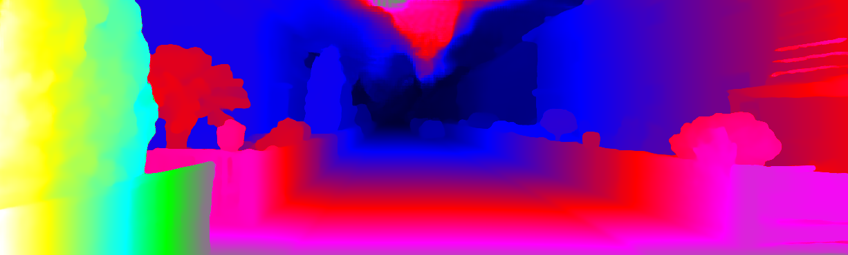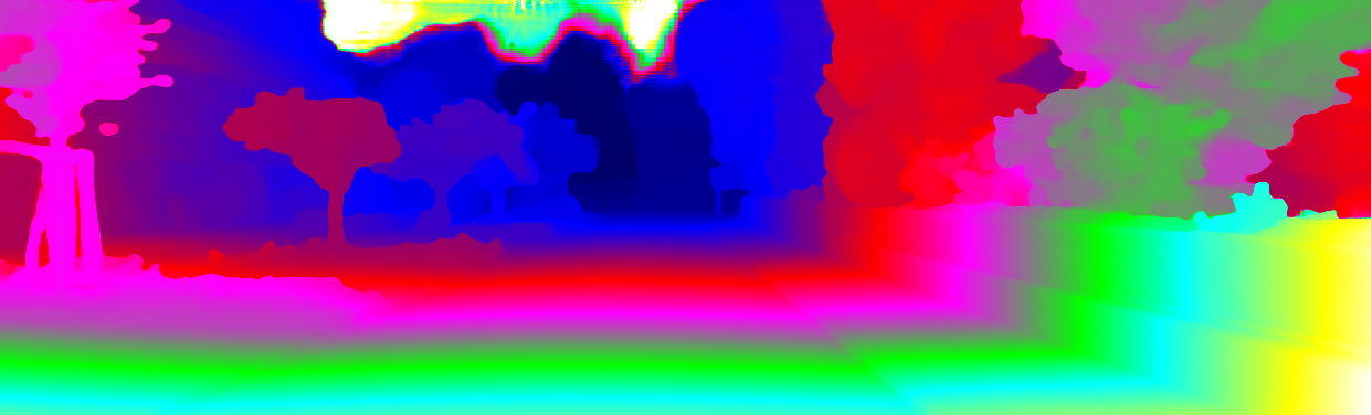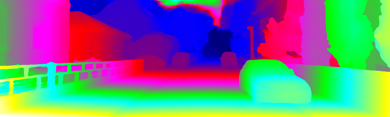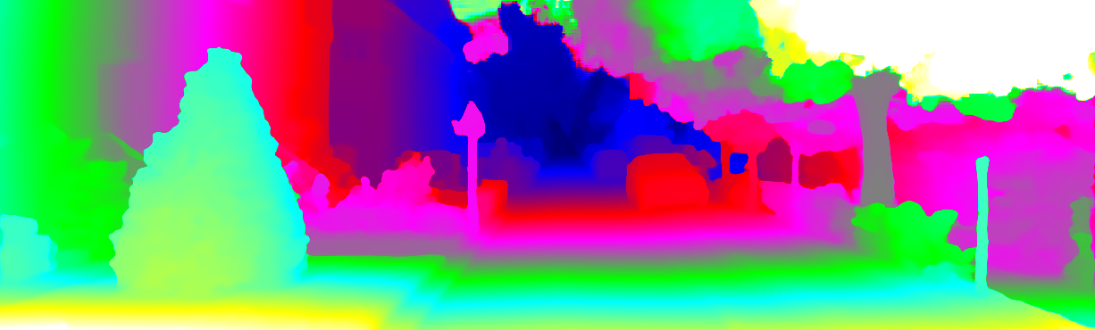 This page provides detailed results for the method(s) selected. For each of the first 20 test images, the number of erroneous pixels at all thresholds is depicted in the table. Underneath, the left input image, the disparity / end-point error map and the estimated (and interpolated) disparity / optical flow map are shown. The error map scales linearly between 0 (black) and >=5 (white) pixels error. Red denotes all occluded pixels, falling outside the image boundaries. The false color map is scaled to the largest ground truth disparity / flow value.