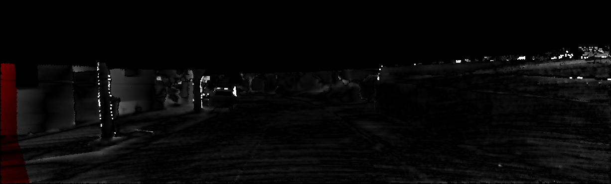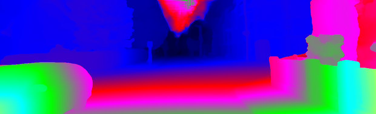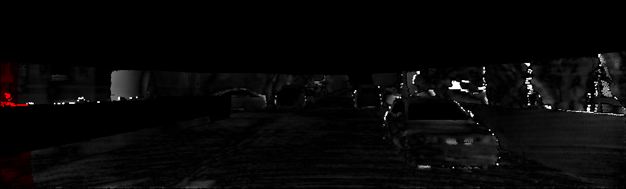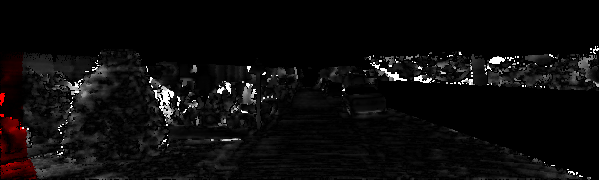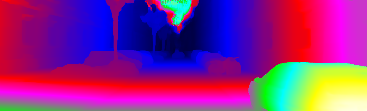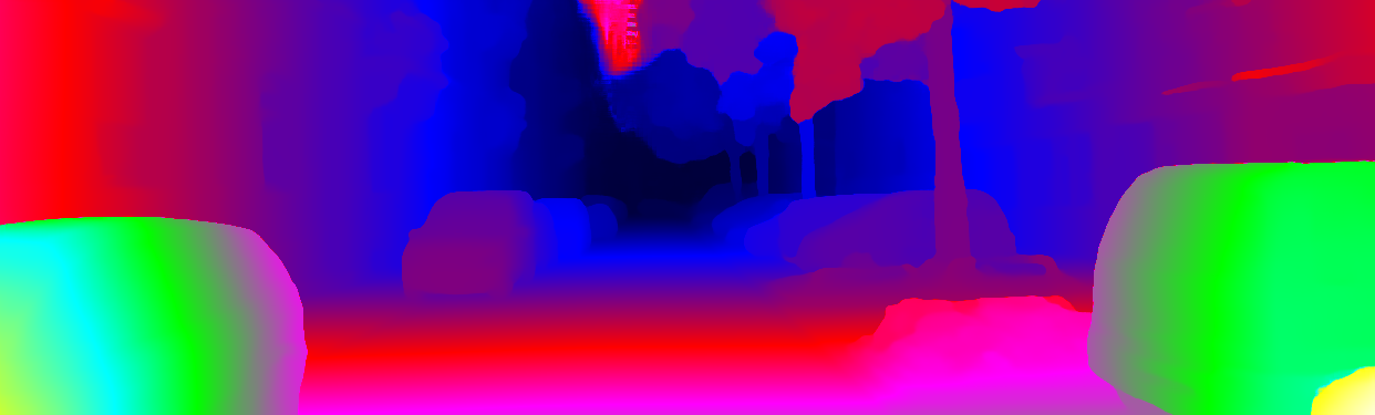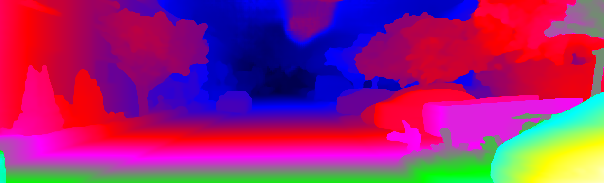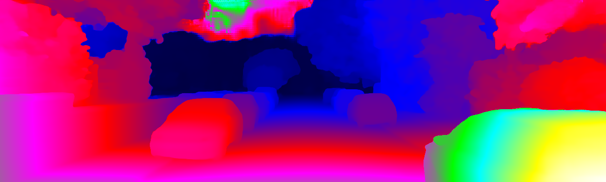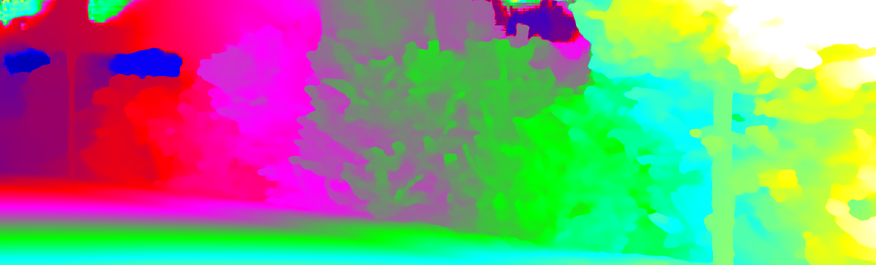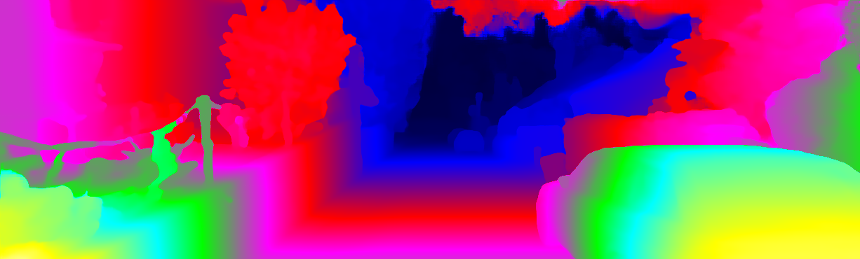 This page provides detailed results for the method(s) selected. For each of the first 20 test images, the number of erroneous pixels at all thresholds is depicted in the table. Underneath, the left input image, the disparity / end-point error map and the estimated (and interpolated) disparity / optical flow map are shown. The error map scales linearly between 0 (black) and >=5 (white) pixels error. Red denotes all occluded pixels, falling outside the image boundaries. The false color map is scaled to the largest ground truth disparity / flow value.