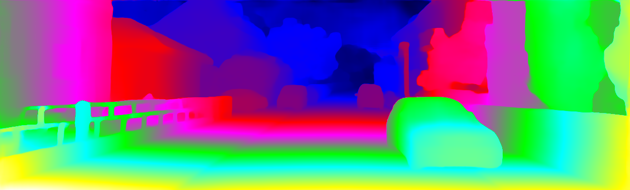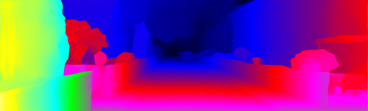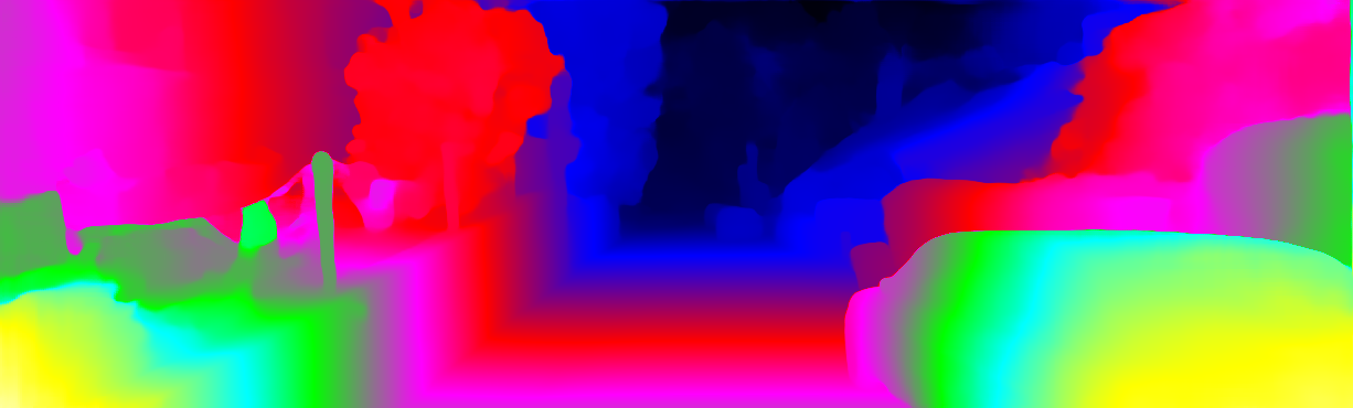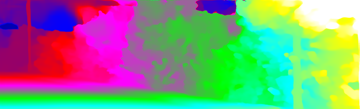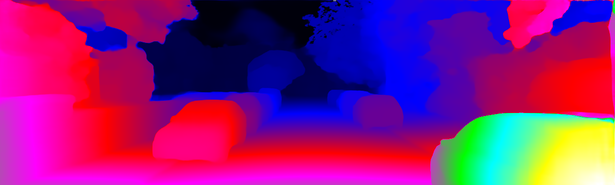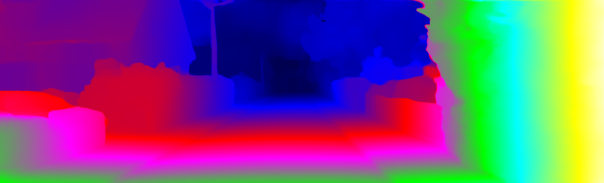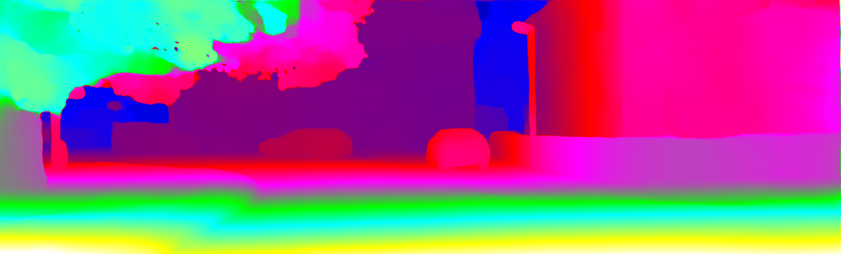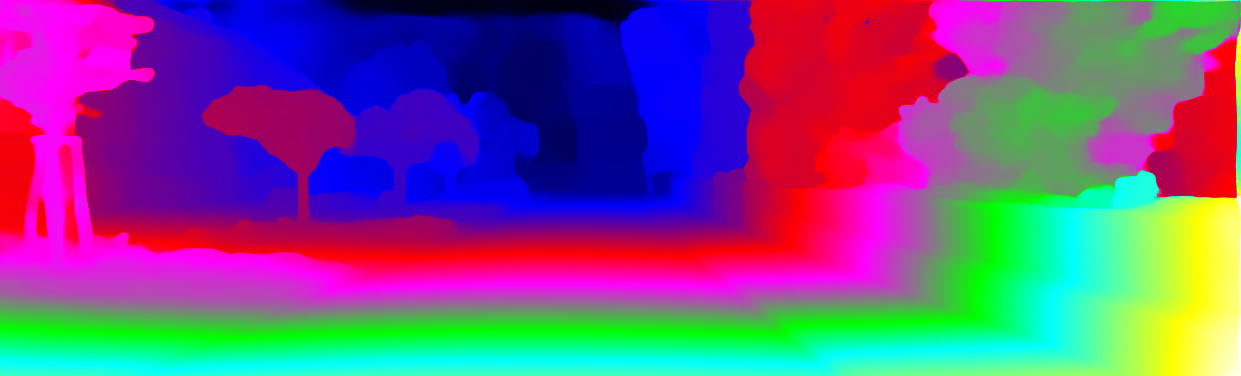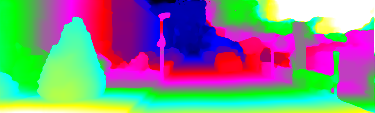 This page provides detailed results for the method(s) selected. For each of the first 20 test images, the number of erroneous pixels at all thresholds is depicted in the table. Underneath, the left input image, the disparity / end-point error map and the estimated (and interpolated) disparity / optical flow map are shown. The error map scales linearly between 0 (black) and >=5 (white) pixels error. Red denotes all occluded pixels, falling outside the image boundaries. The false color map is scaled to the largest ground truth disparity / flow value.