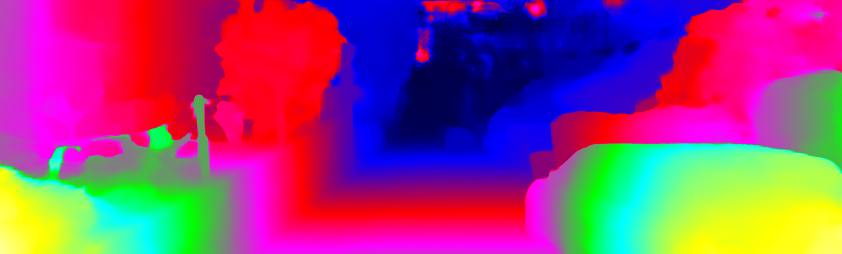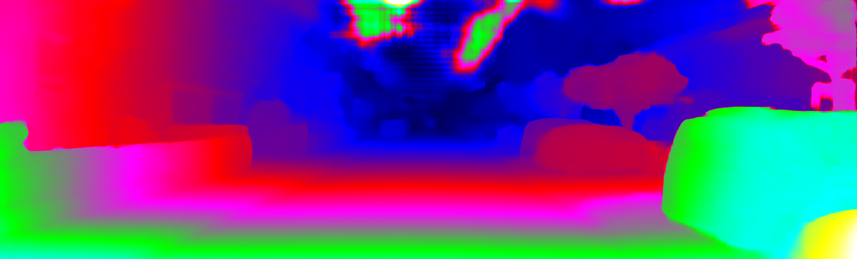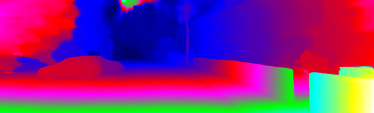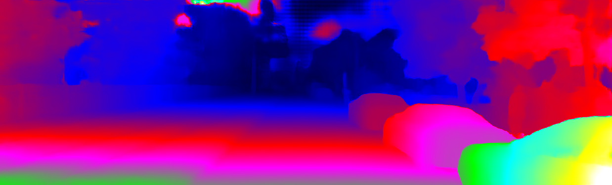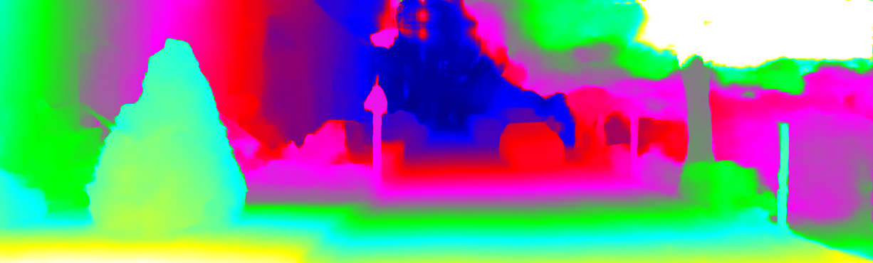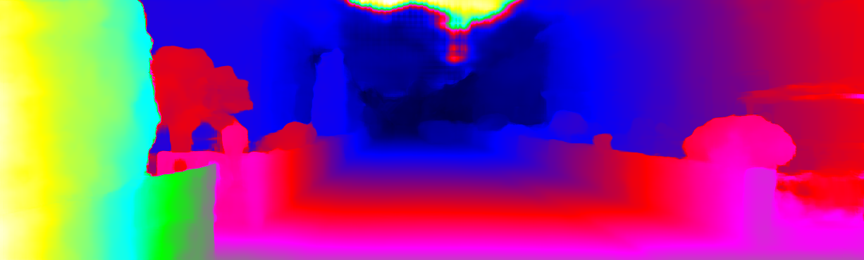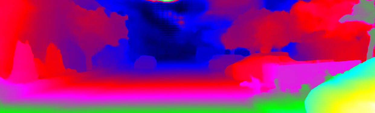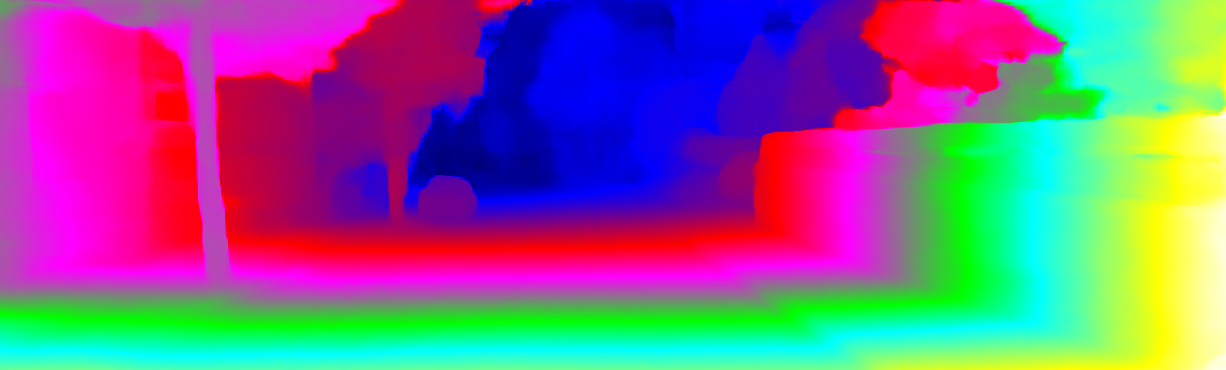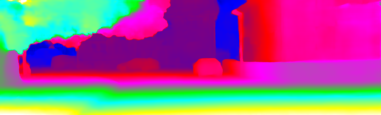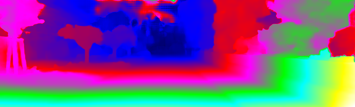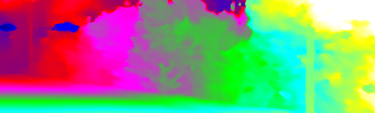 This page provides detailed results for the method(s) selected. For each of the first 20 test images, the number of erroneous pixels at all thresholds is depicted in the table. Underneath, the left input image, the disparity / end-point error map and the estimated (and interpolated) disparity / optical flow map are shown. The error map scales linearly between 0 (black) and >=5 (white) pixels error. Red denotes all occluded pixels, falling outside the image boundaries. The false color map is scaled to the largest ground truth disparity / flow value.
