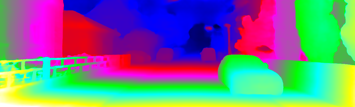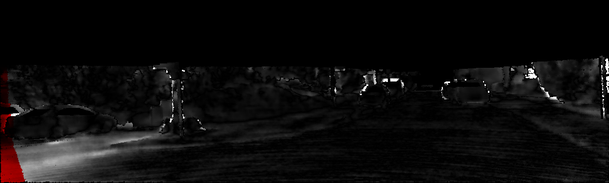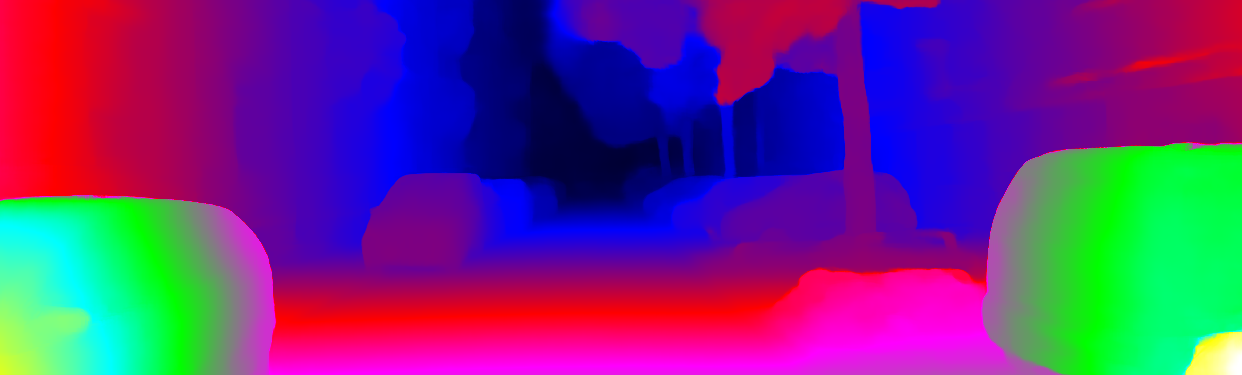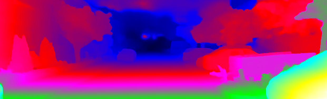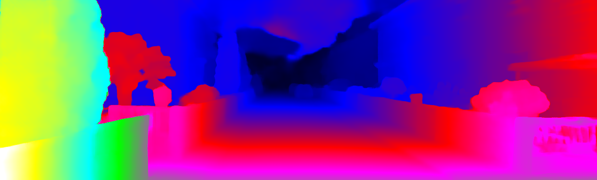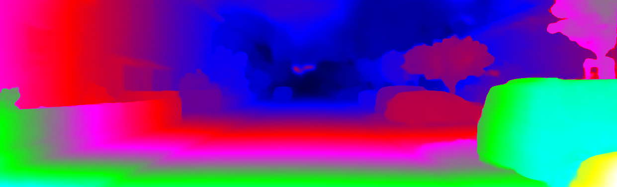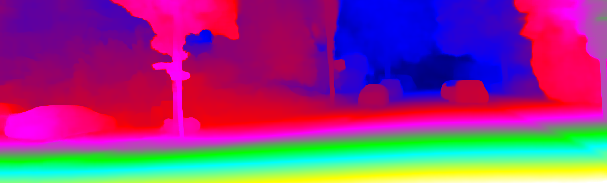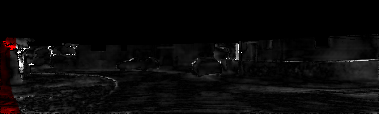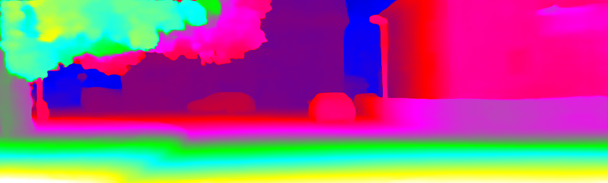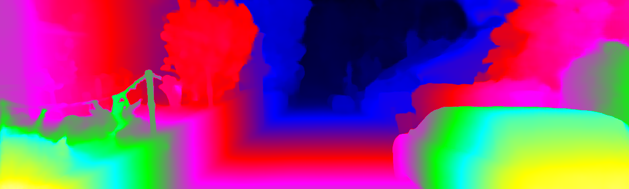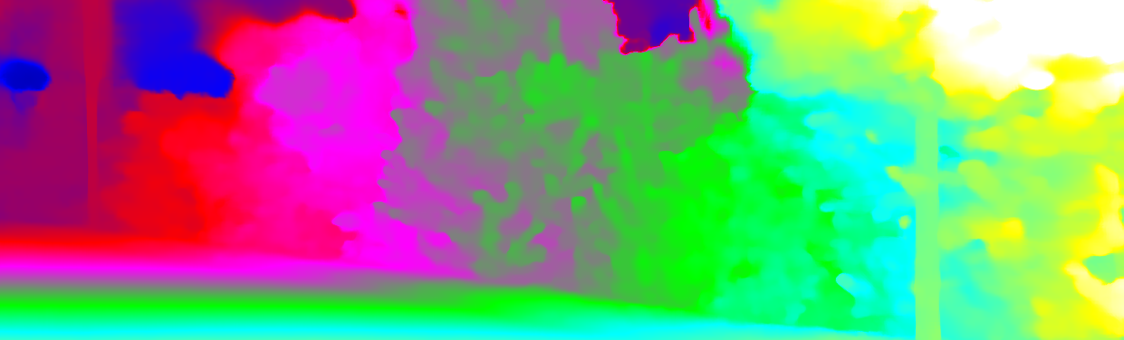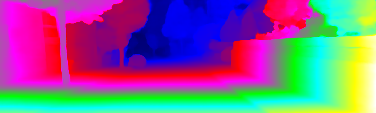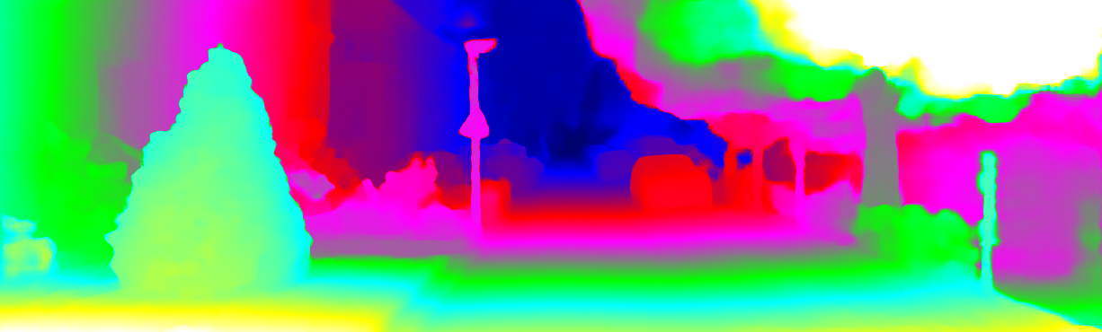 This page provides detailed results for the method(s) selected. For each of the first 20 test images, the number of erroneous pixels at all thresholds is depicted in the table. Underneath, the left input image, the disparity / end-point error map and the estimated (and interpolated) disparity / optical flow map are shown. The error map scales linearly between 0 (black) and >=5 (white) pixels error. Red denotes all occluded pixels, falling outside the image boundaries. The false color map is scaled to the largest ground truth disparity / flow value.