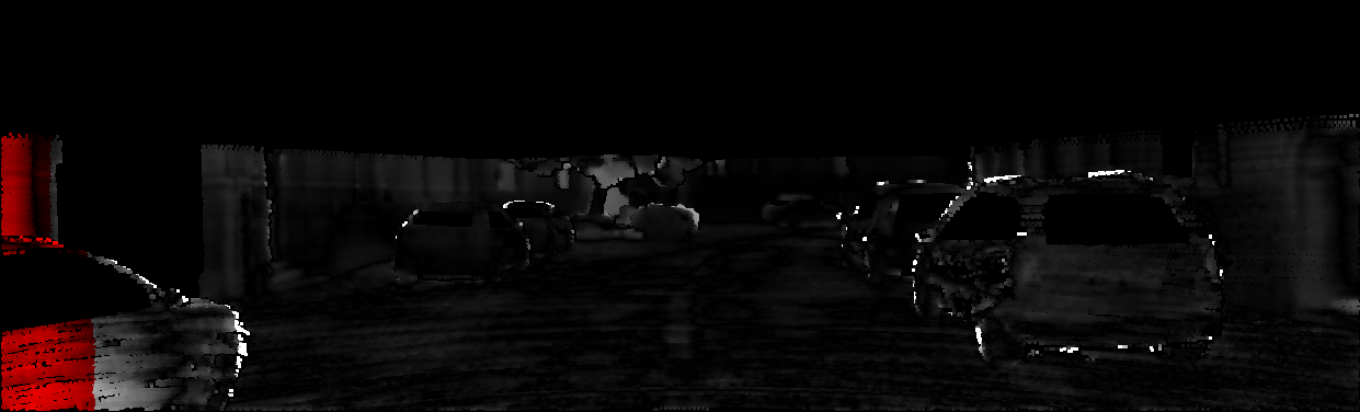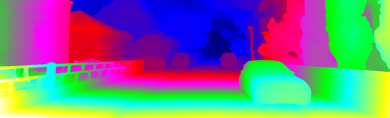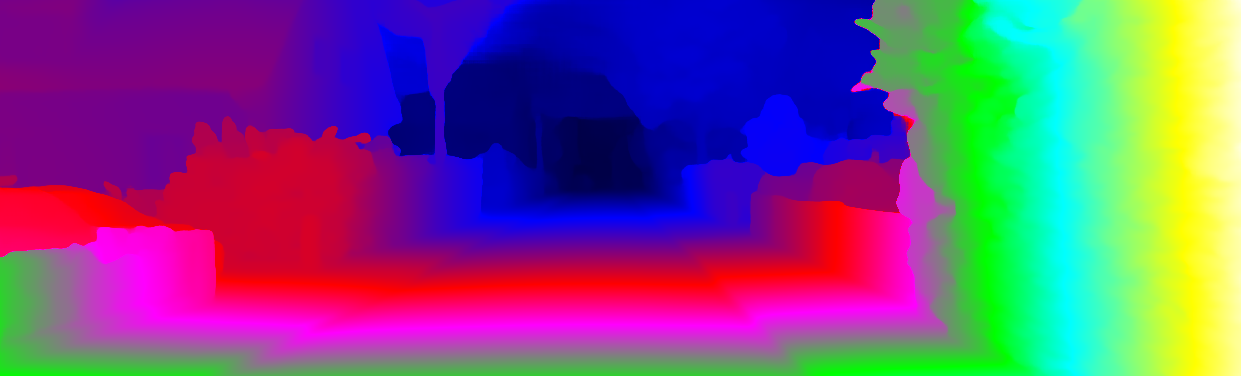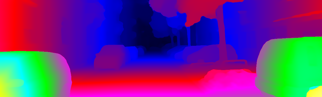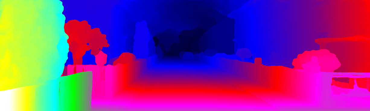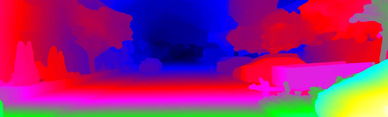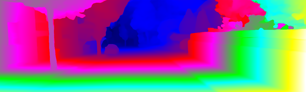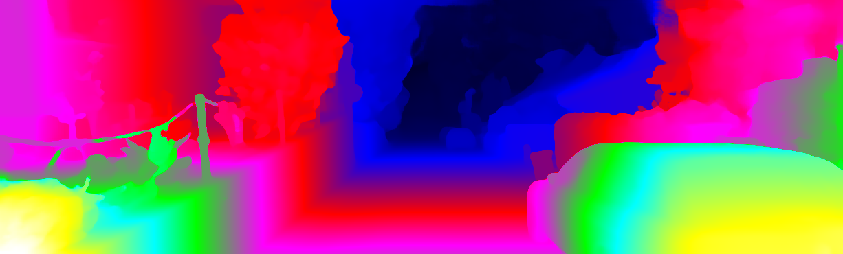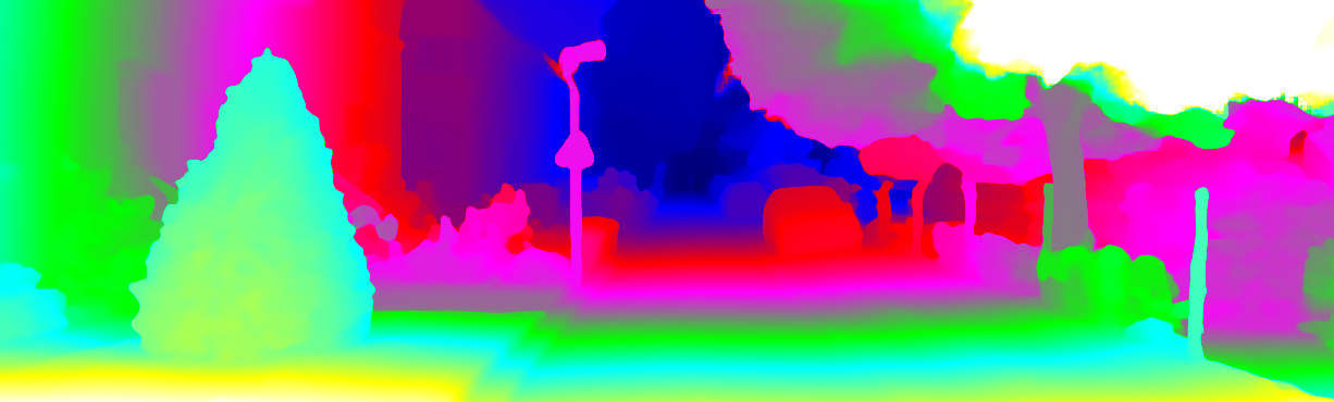 This page provides detailed results for the method(s) selected. For each of the first 20 test images, the number of erroneous pixels at all thresholds is depicted in the table. Underneath, the left input image, the disparity / end-point error map and the estimated (and interpolated) disparity / optical flow map are shown. The error map scales linearly between 0 (black) and >=5 (white) pixels error. Red denotes all occluded pixels, falling outside the image boundaries. The false color map is scaled to the largest ground truth disparity / flow value.