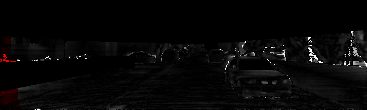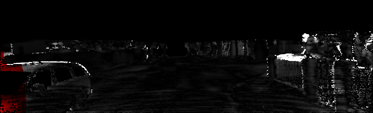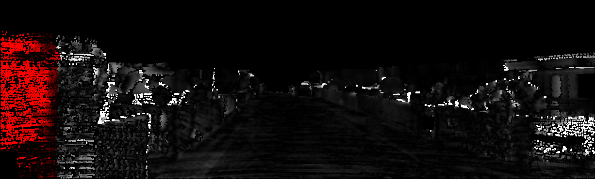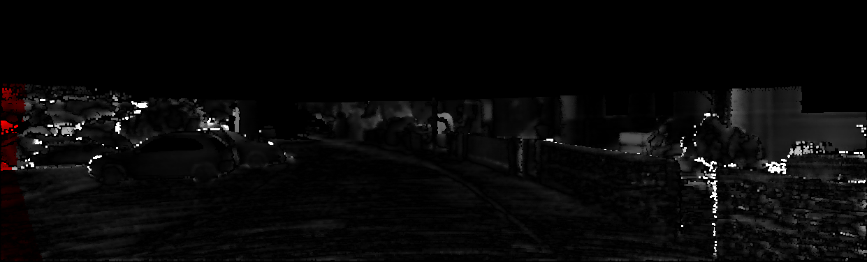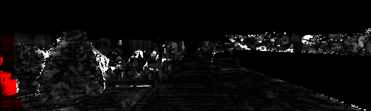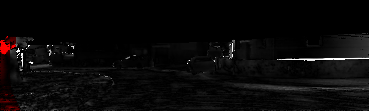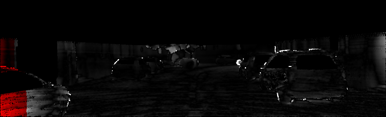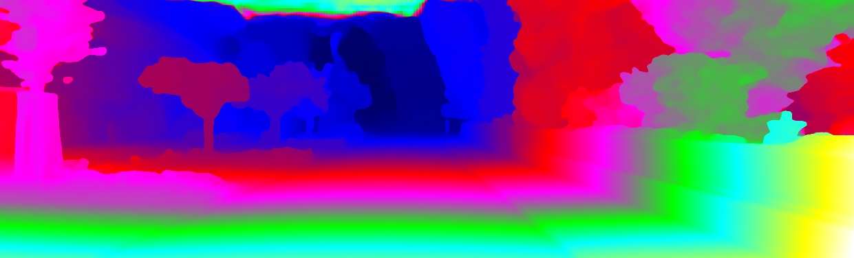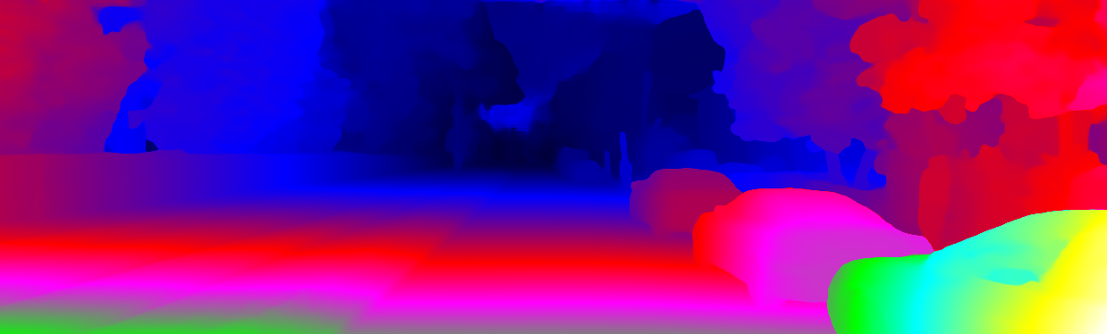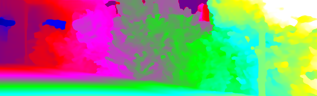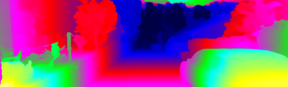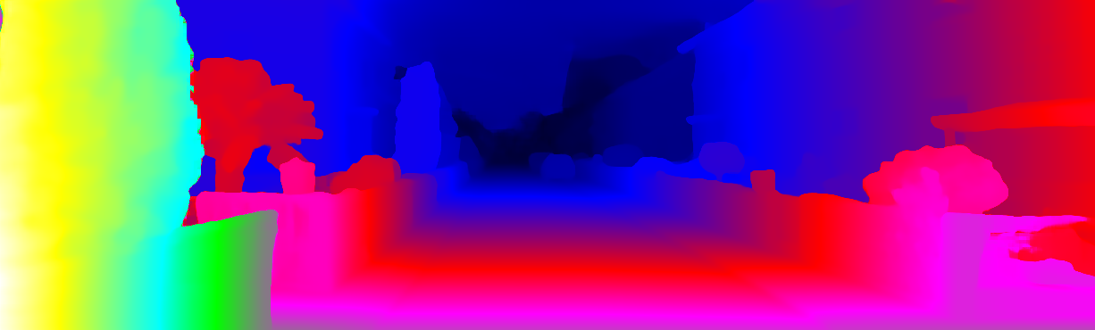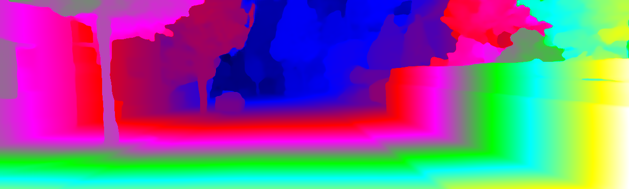 This page provides detailed results for the method(s) selected. For each of the first 20 test images, the number of erroneous pixels at all thresholds is depicted in the table. Underneath, the left input image, the disparity / end-point error map and the estimated (and interpolated) disparity / optical flow map are shown. The error map scales linearly between 0 (black) and >=5 (white) pixels error. Red denotes all occluded pixels, falling outside the image boundaries. The false color map is scaled to the largest ground truth disparity / flow value.