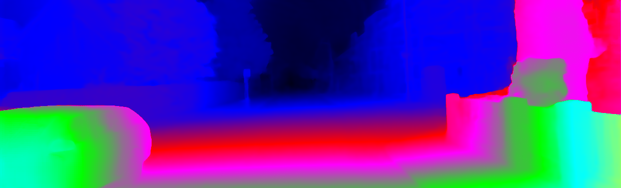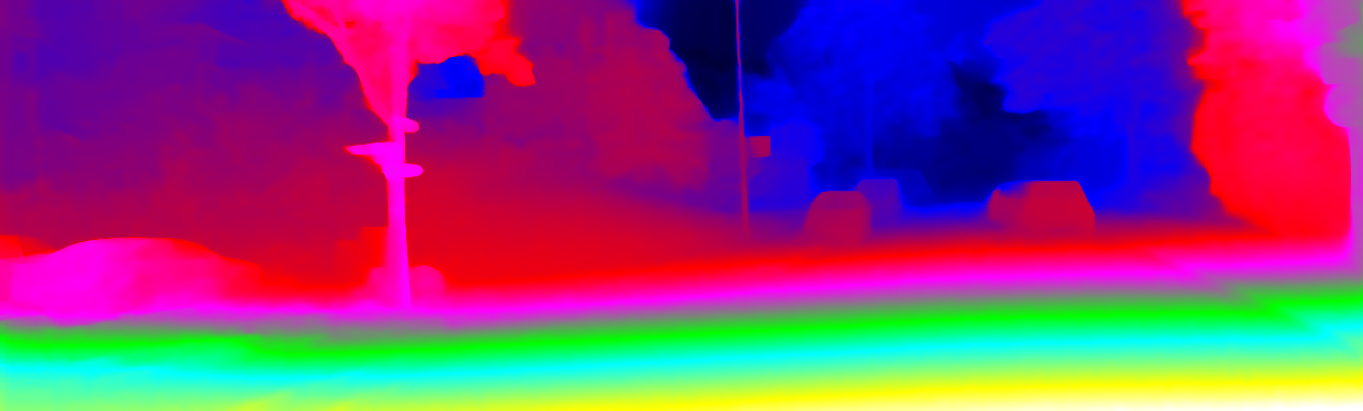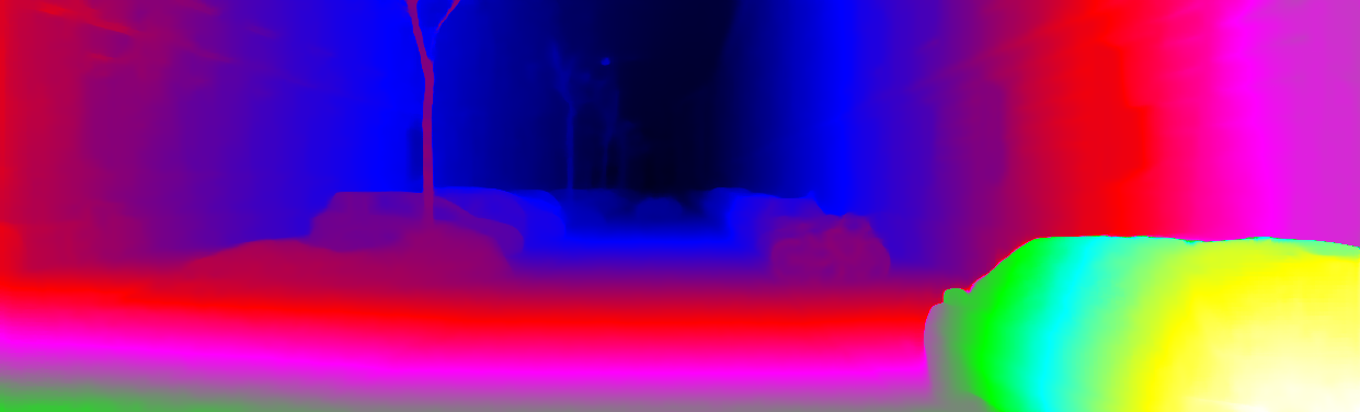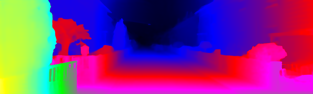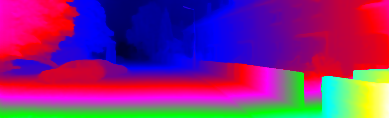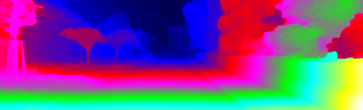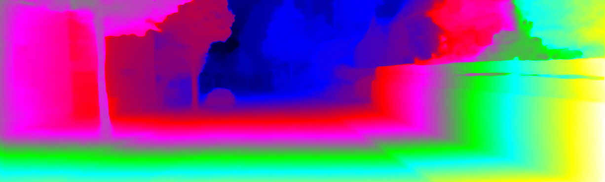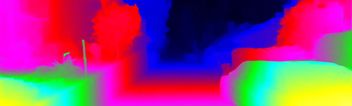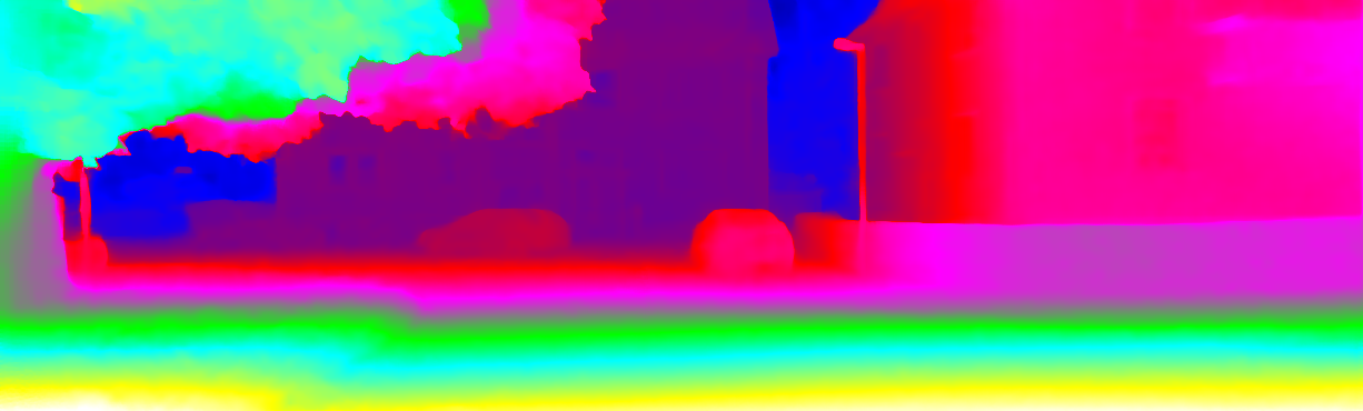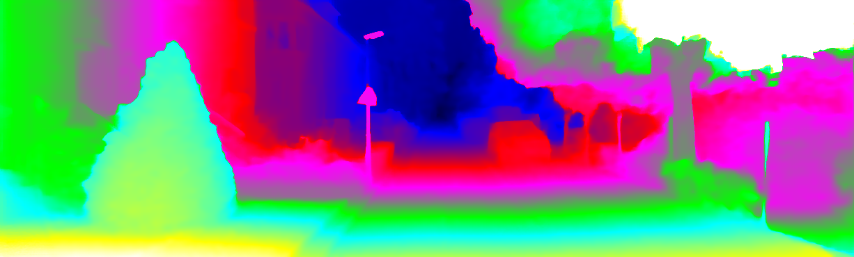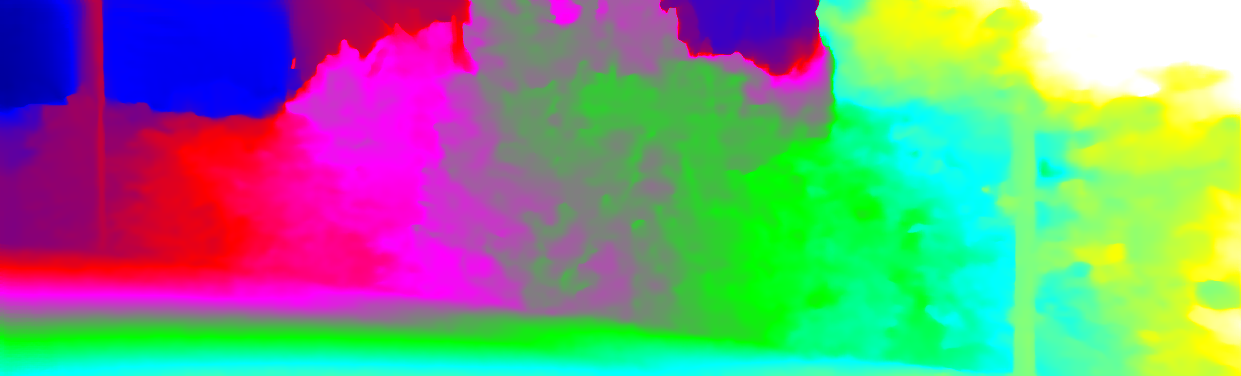 This page provides detailed results for the method(s) selected. For each of the first 20 test images, the number of erroneous pixels at all thresholds is depicted in the table. Underneath, the left input image, the disparity / end-point error map and the estimated (and interpolated) disparity / optical flow map are shown. The error map scales linearly between 0 (black) and >=5 (white) pixels error. Red denotes all occluded pixels, falling outside the image boundaries. The false color map is scaled to the largest ground truth disparity / flow value.