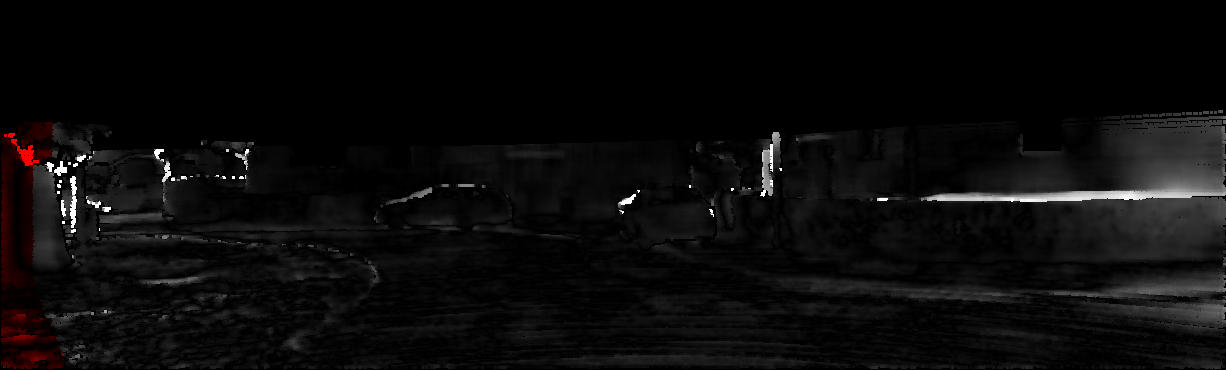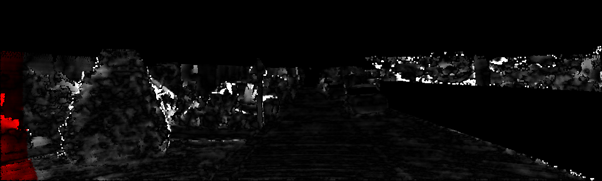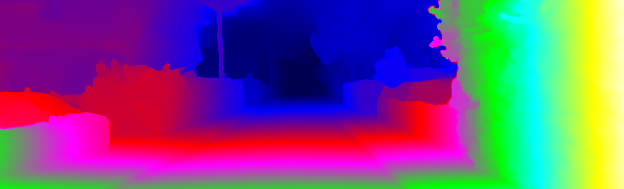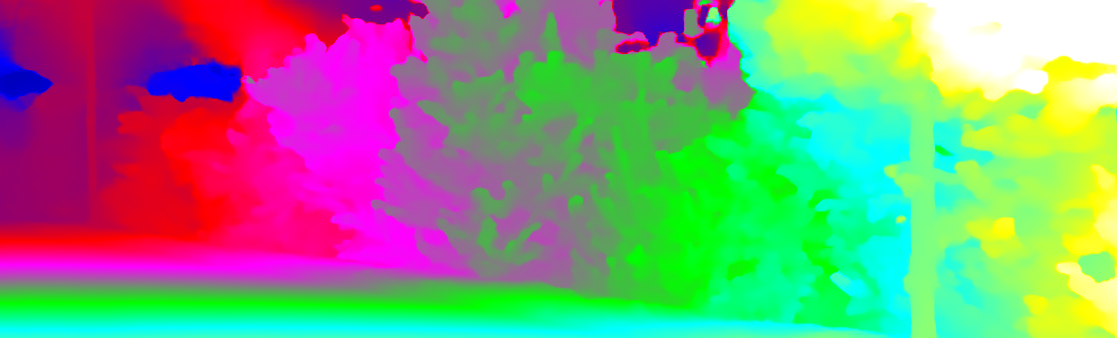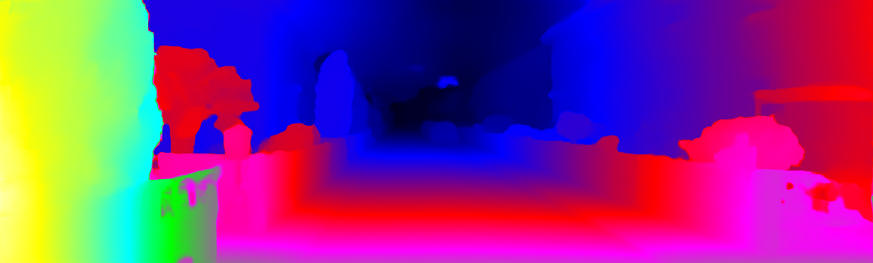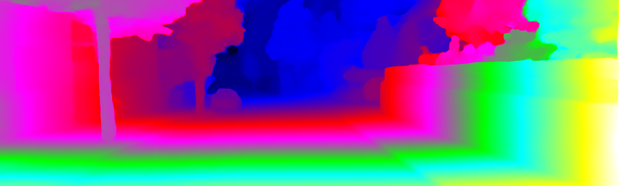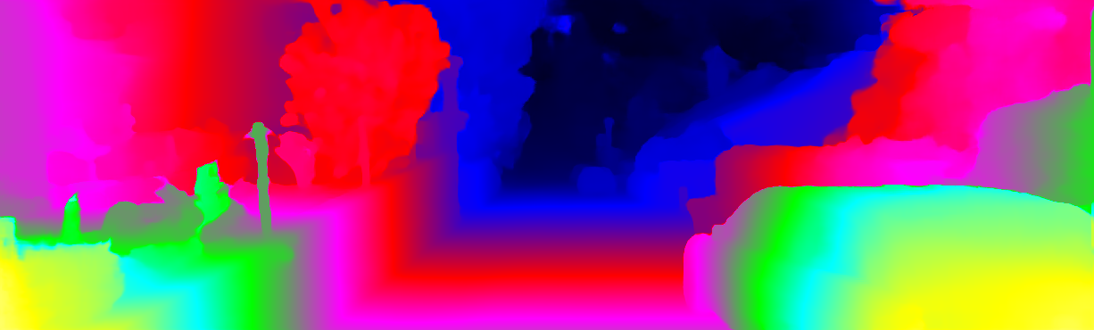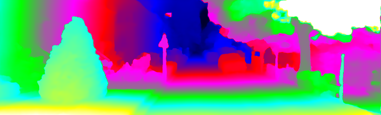This page provides detailed results for the method(s) selected. For each of the first 20 test images, the number of erroneous pixels at all thresholds is depicted in the table. Underneath, the left input image, the disparity / end-point error map and the estimated (and interpolated) disparity / optical flow map are shown. The error map scales linearly between 0 (black) and >=5 (white) pixels error. Red denotes all occluded pixels, falling outside the image boundaries. The false color map is scaled to the largest ground truth disparity / flow value.