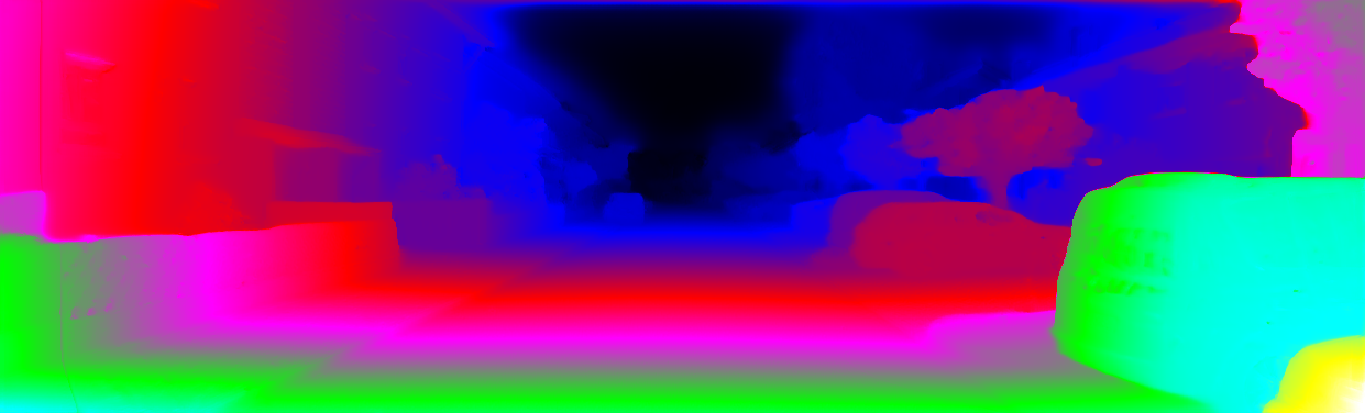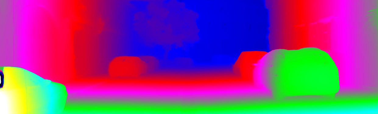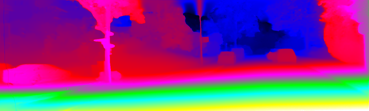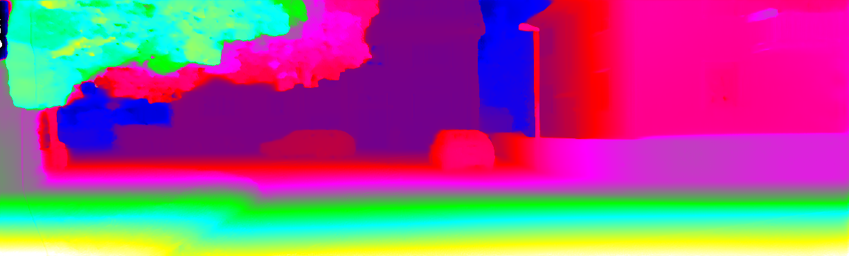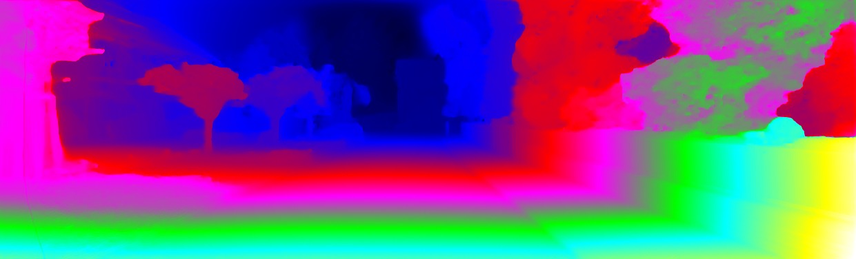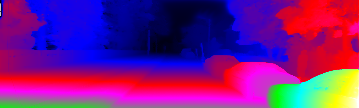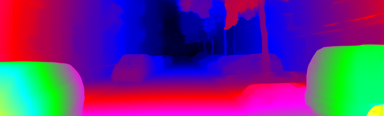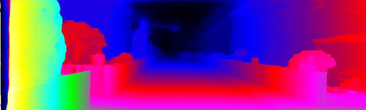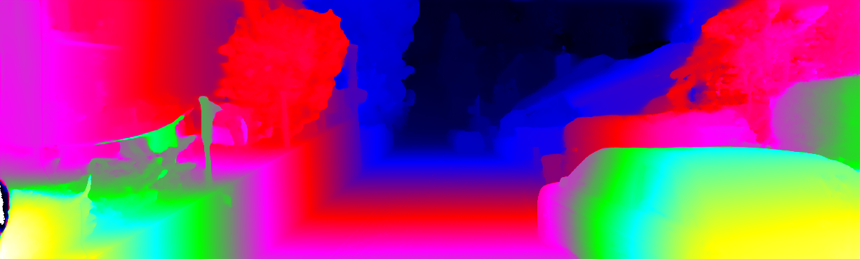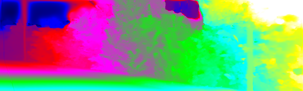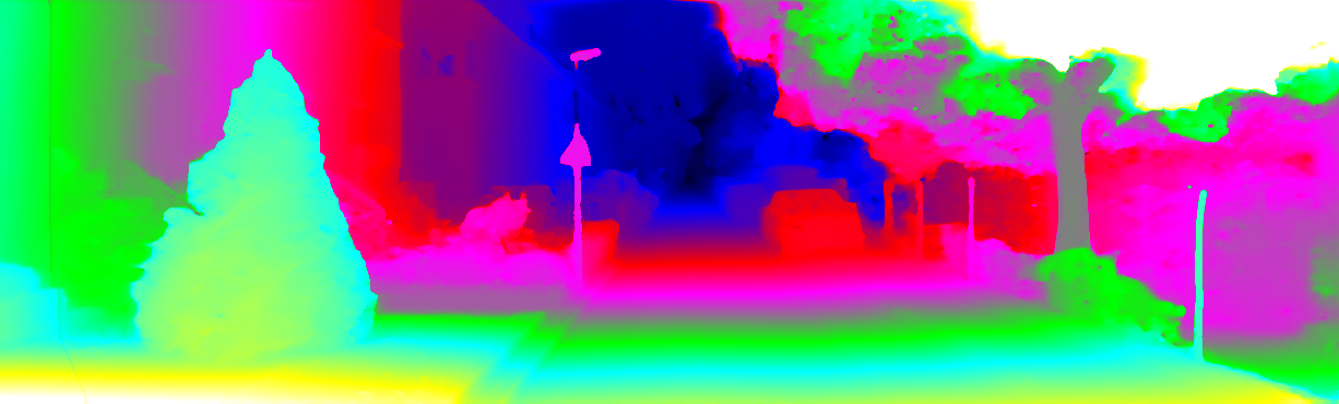 This page provides detailed results for the method(s) selected. For each of the first 20 test images, the number of erroneous pixels at all thresholds is depicted in the table. Underneath, the left input image, the disparity / end-point error map and the estimated (and interpolated) disparity / optical flow map are shown. The error map scales linearly between 0 (black) and >=5 (white) pixels error. Red denotes all occluded pixels, falling outside the image boundaries. The false color map is scaled to the largest ground truth disparity / flow value.