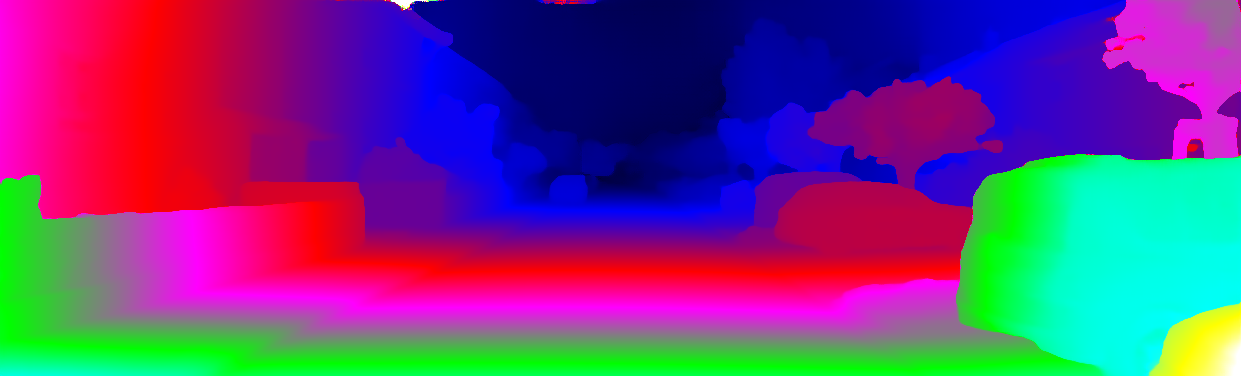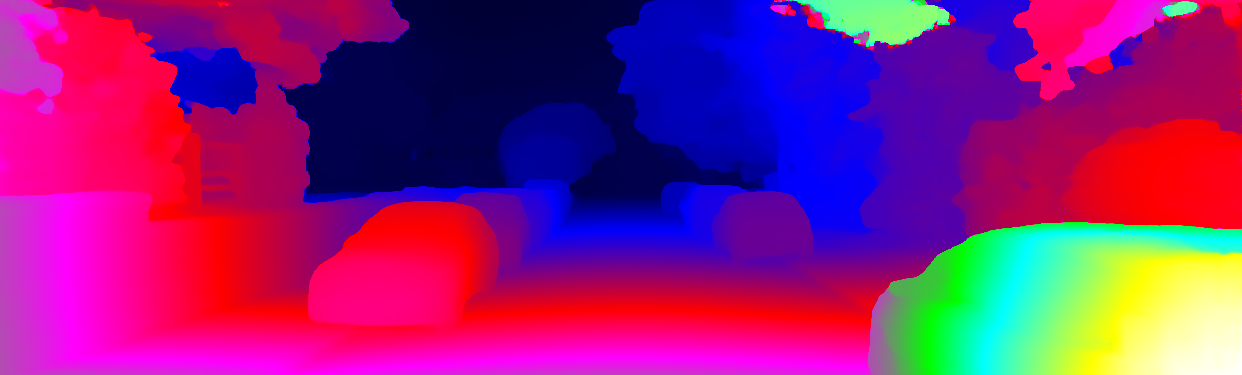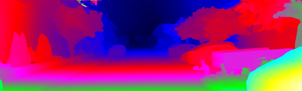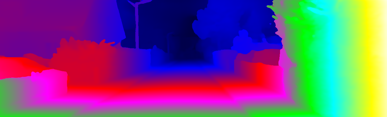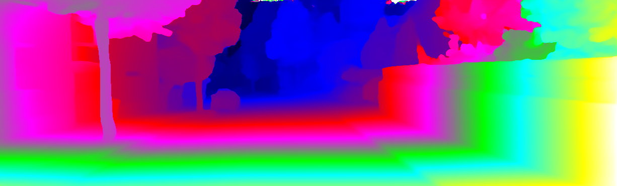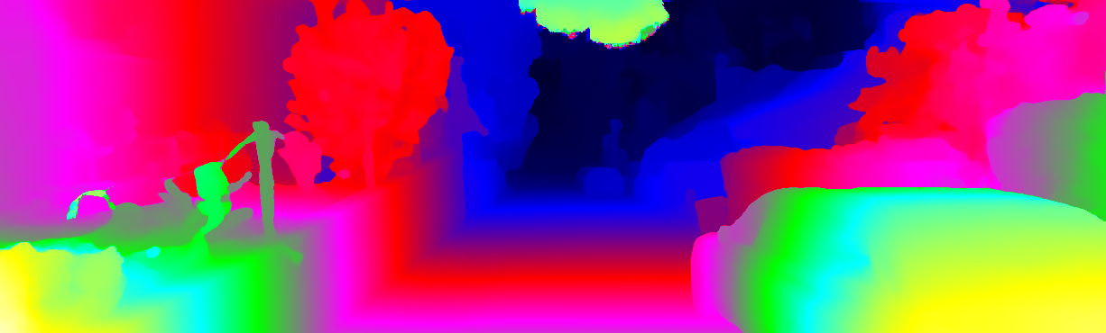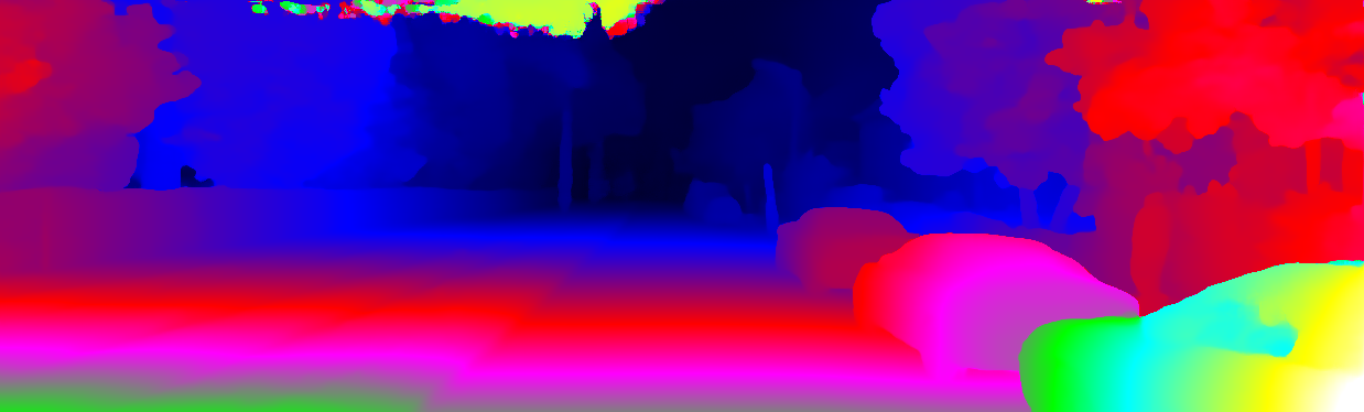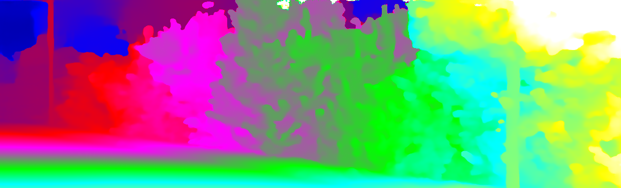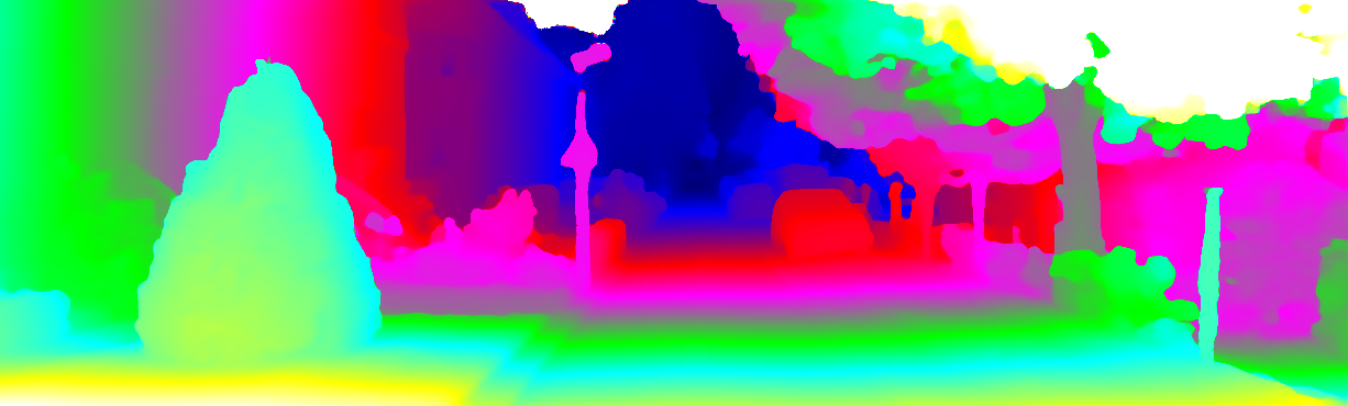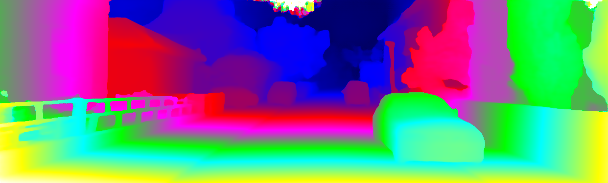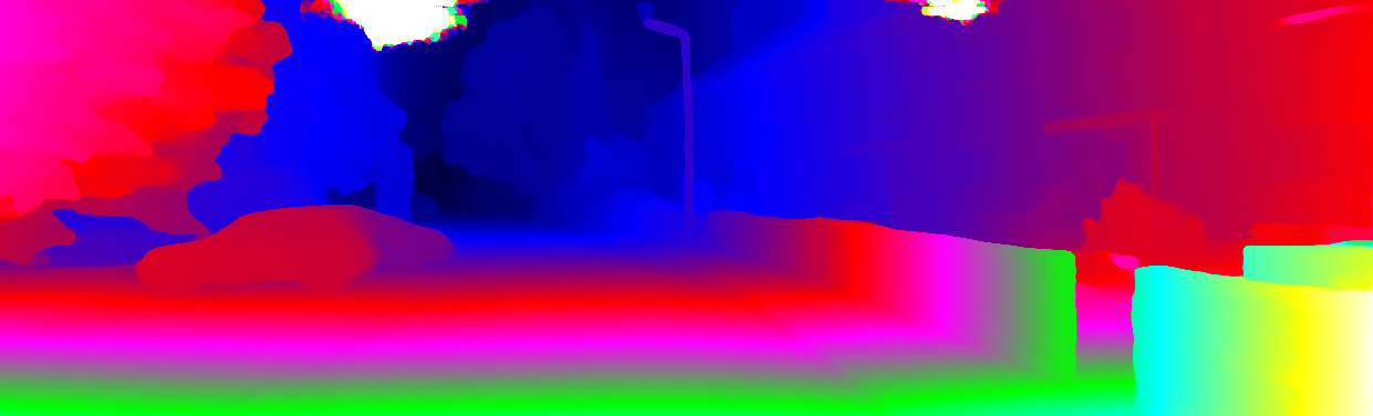 This page provides detailed results for the method(s) selected. For each of the first 20 test images, the number of erroneous pixels at all thresholds is depicted in the table. Underneath, the left input image, the disparity / end-point error map and the estimated (and interpolated) disparity / optical flow map are shown. The error map scales linearly between 0 (black) and >=5 (white) pixels error. Red denotes all occluded pixels, falling outside the image boundaries. The false color map is scaled to the largest ground truth disparity / flow value.